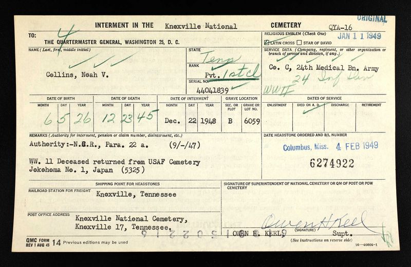 Pvt Collins was initially buried at the USAF Cemetery Jokohoma No. 1, Japan