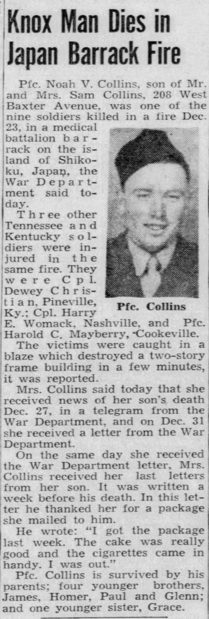 Pfc. Noah V. Collins, son of Mr. and Mrs. Sam Collins, 208 West Baxter Avenue, was one of the nine soldiers killed in a fire Dec. 23, in a medical battalion barrack on the island of Shikoku, Japan, the War Department said today. Three other Tennessee and Kentucky soldiers were injured in the fire. They were Cpl. Dewey Christian, Pineville, Ky.; Cpl. Harry E. Womack, Nashville and Pfc. Harold C. Mayberry, Cookeville. The victims were caught in a blaze which destroyed a two-story frame building in a few minutes, it was reported. Mrs. Collins said today that she received news of her son’s death Dec. 27 in a telegram from the War Department, and on Dec. 31 she received a letter from the War Department. On the same day she received the letter, Mrs. Collins received her last letters from her son. It was written a week before his death. In this letter he thanked her for a package she mailed to him. He wrote: “I got the package last week. The cake was really good and the cigarettes came in Handy. I was out.”
