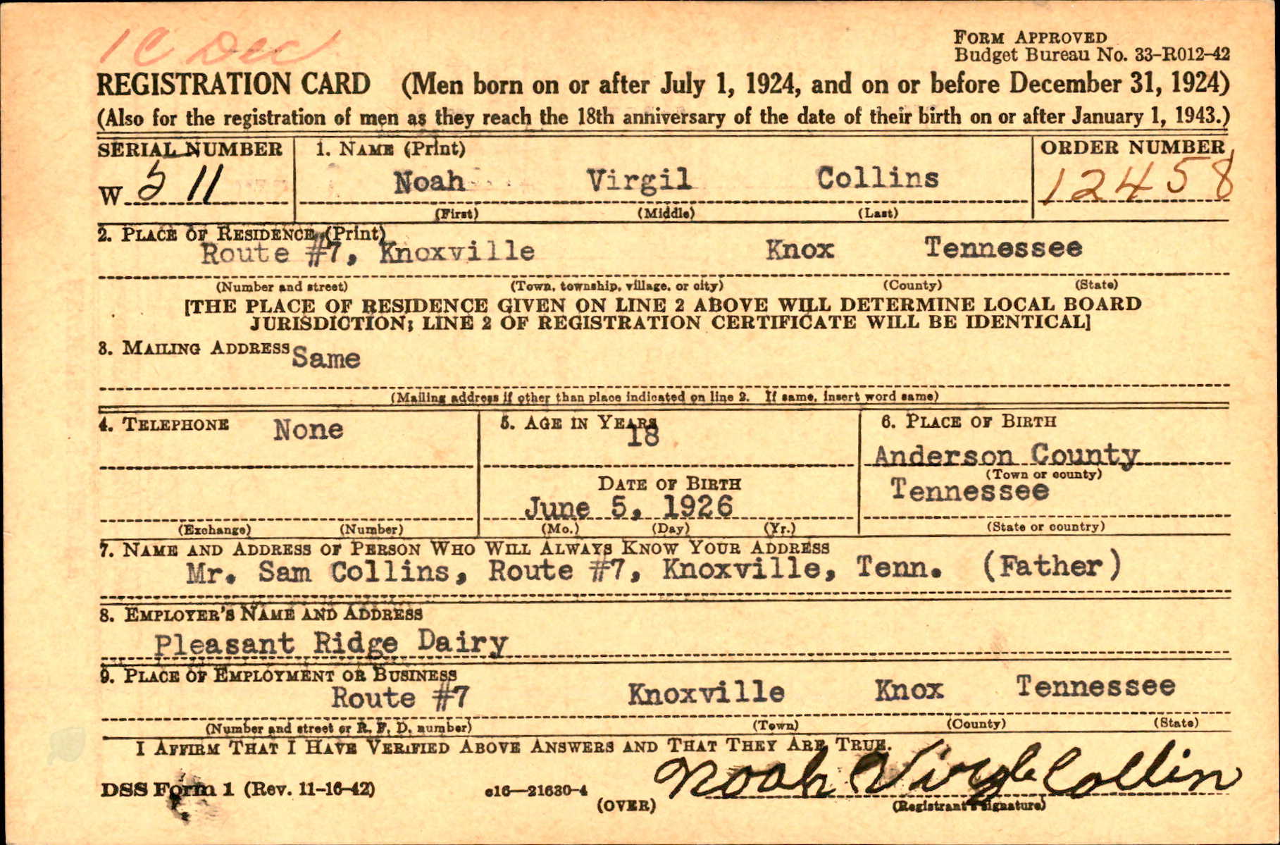 Noah Virgil Collins was born on 5 June 1926 in Anderson County, Tennessee, the son of Samuel “Sam” McKinley Collins and Maude Crawford.