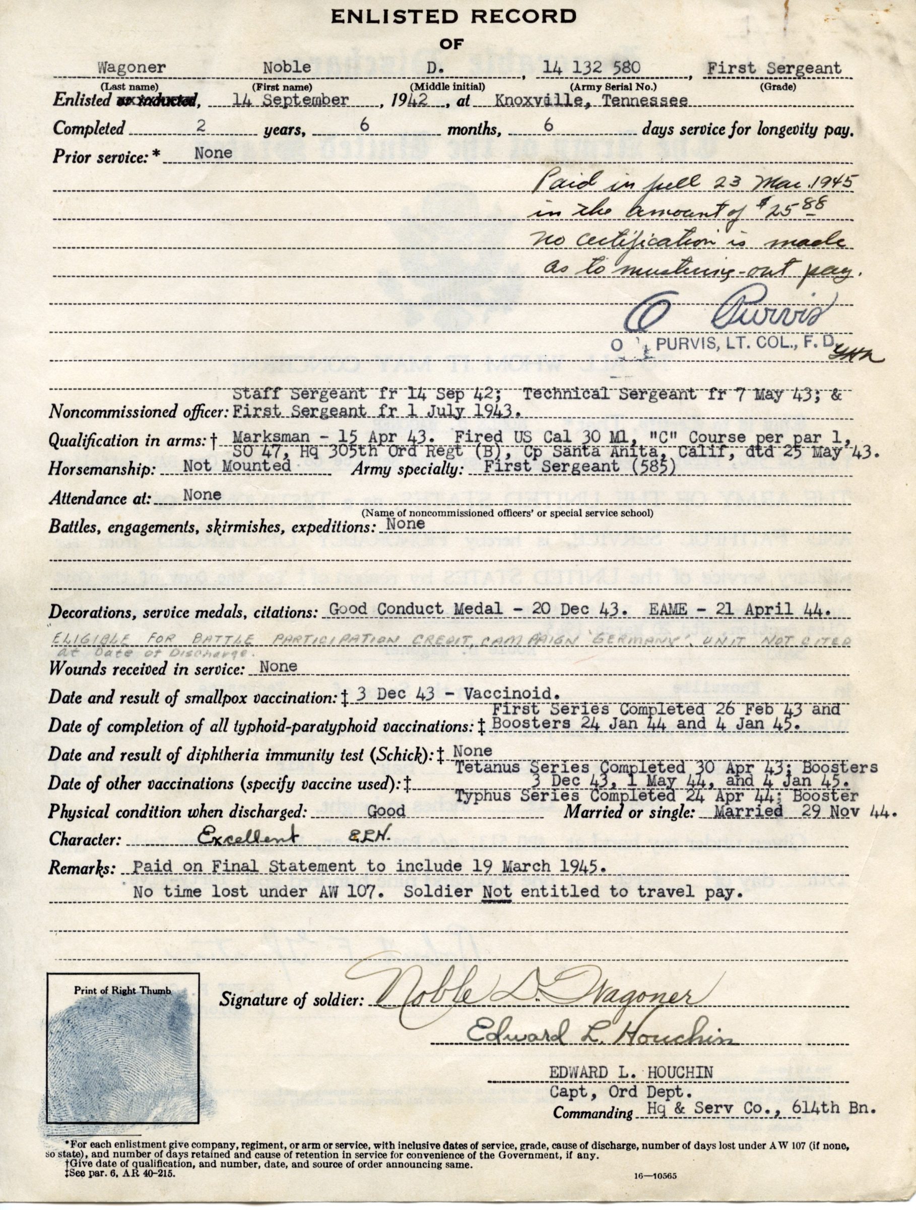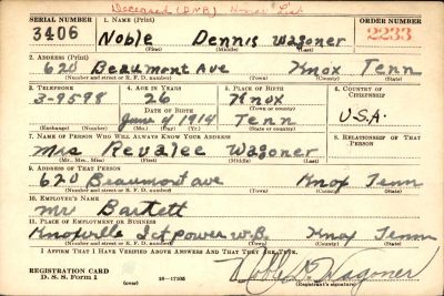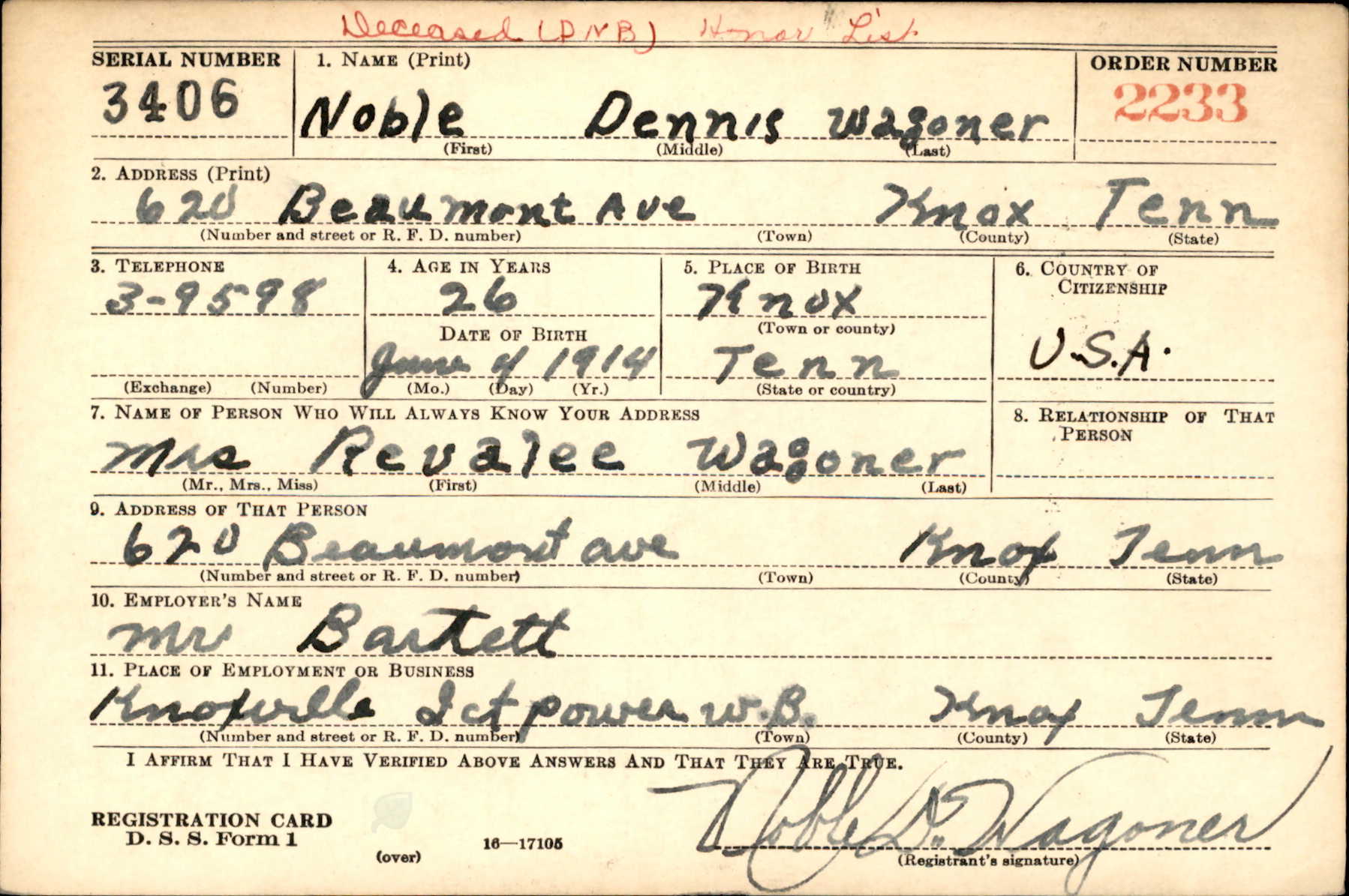 Noble Dennis Wagoner was born on 4 June 1914, Knoxville, Knox County, Tennessee, the son of George Elmer Waggoner and Cordelia Frances Wagoner. He was married to Reba Lee Finch and they had a five year old daughter.