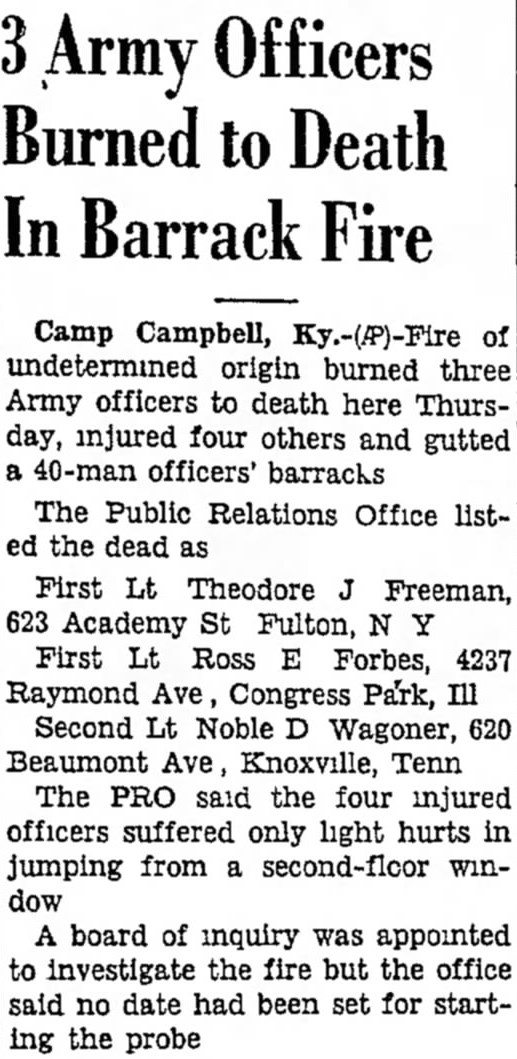 Three Officers died in Barracks Blaze. Camp Campbell, Ky – Fire of undetermined origin burned three Army officers to death here, injured four others and gutted a 40-man officers´ barracks. The public relations office listed the dead as: