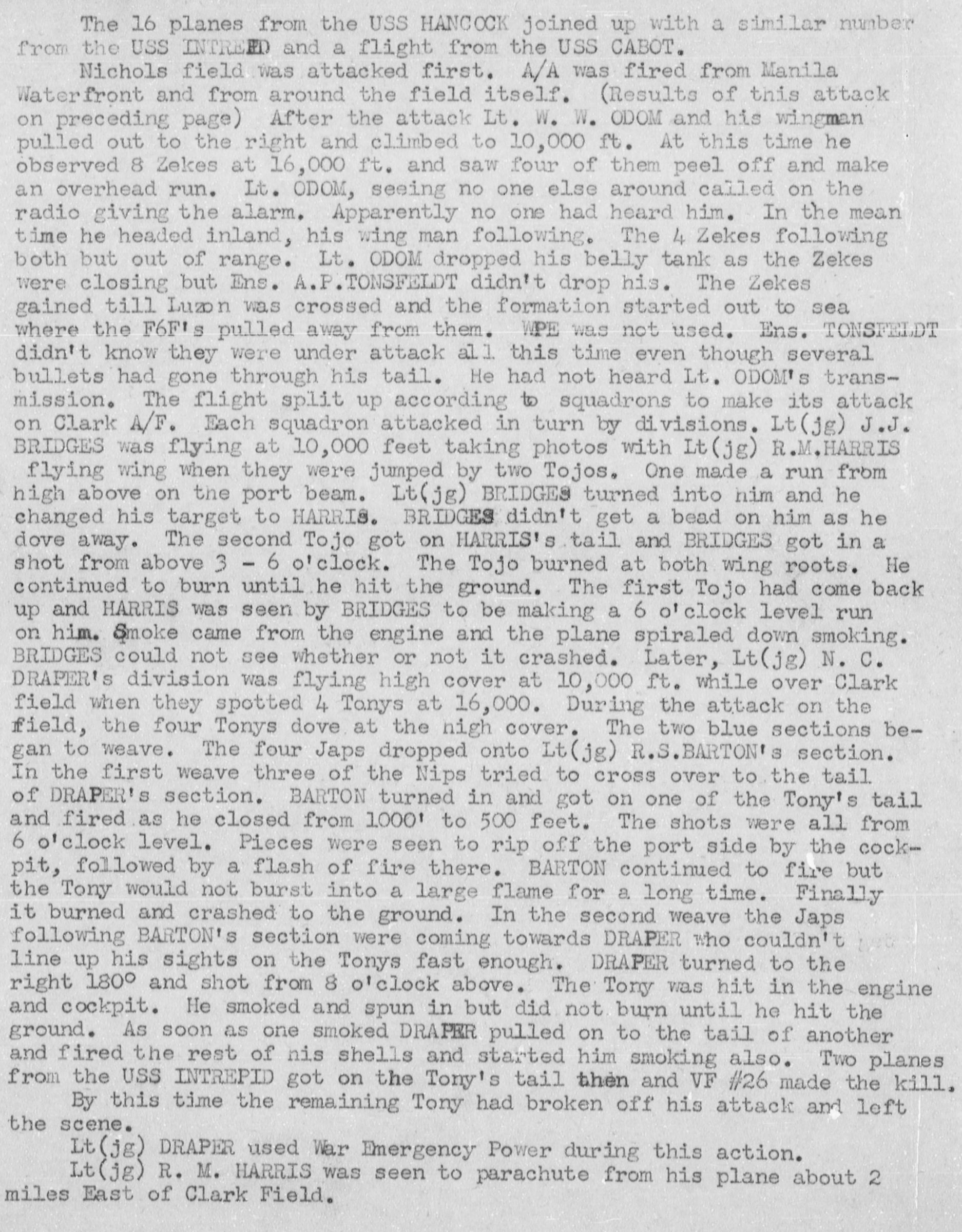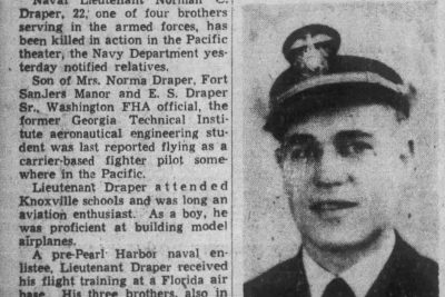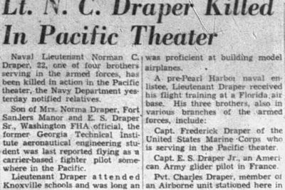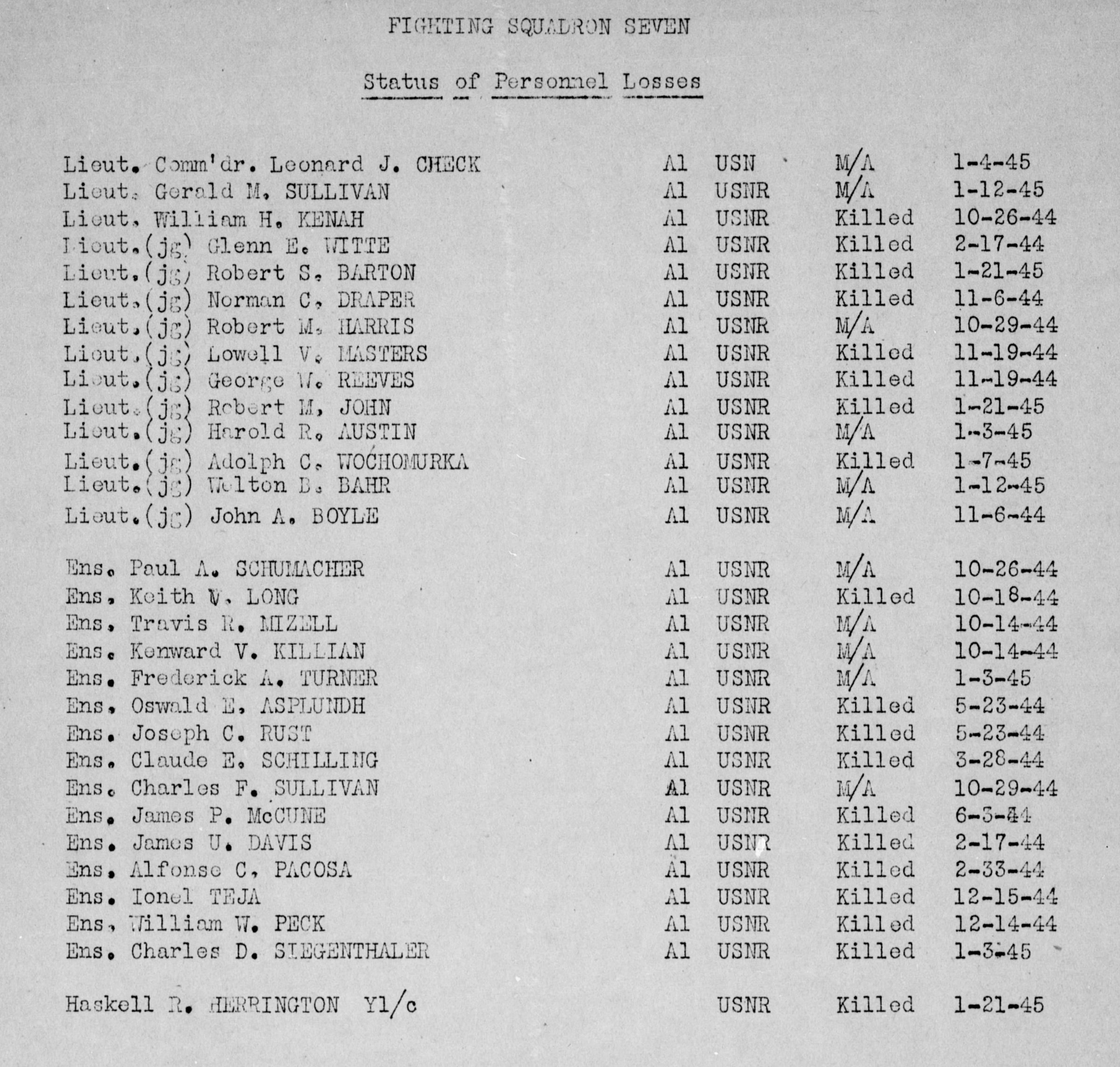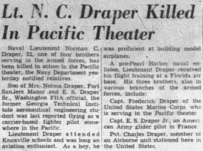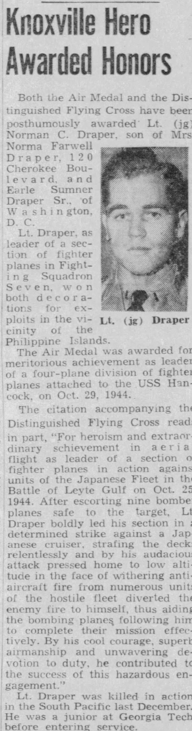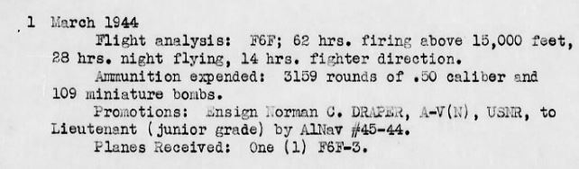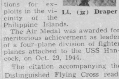 The Squadron was shipped aboard the USS Hancock in 1944. The Hancock was part of the invasion force sent to reclaim the Philippines. It was during this that the VF-7 was involved in the Battle of Leyte Gulf. LtJg Draper, flying a F6F-5 BuNo. 70353, was killed in action on 6 November 1944. He is remembered on the Tablets of the Missing, Manila American Cemetery, Manila, Philippines.