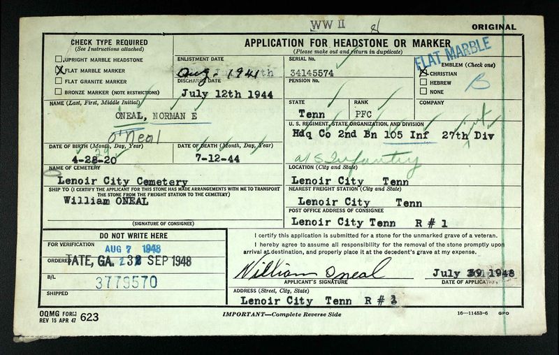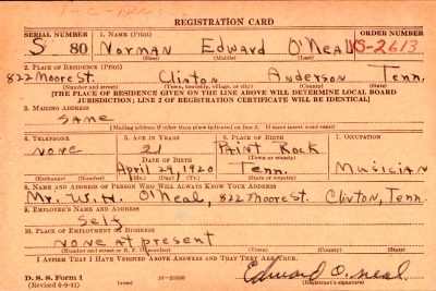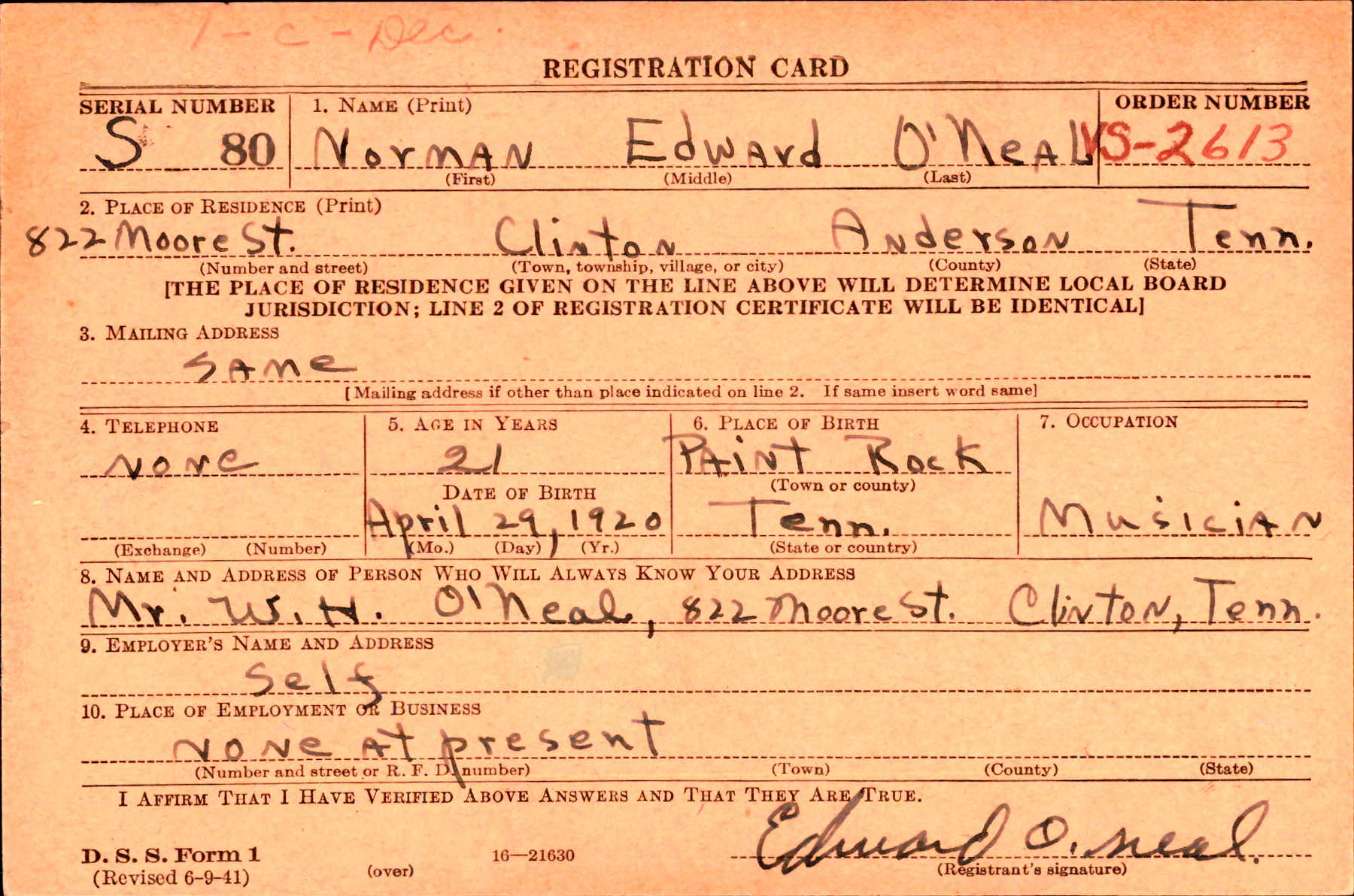 Norman Edward O’Neal was born in Paint Rock, Tenn. to William Henry O’Neal and Celia Elizabeth Huckaby.