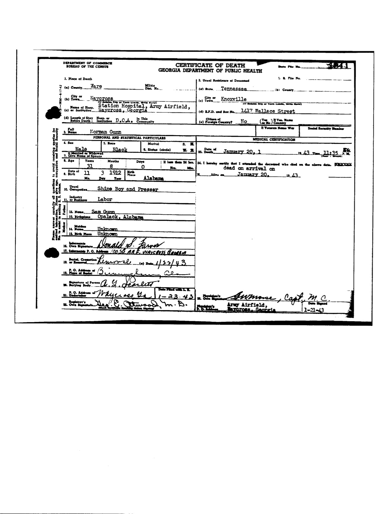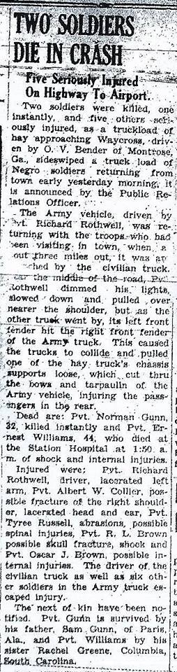 -Died in a traffic accident near Waycross Army Airbase in Georgia on January 20, 1943