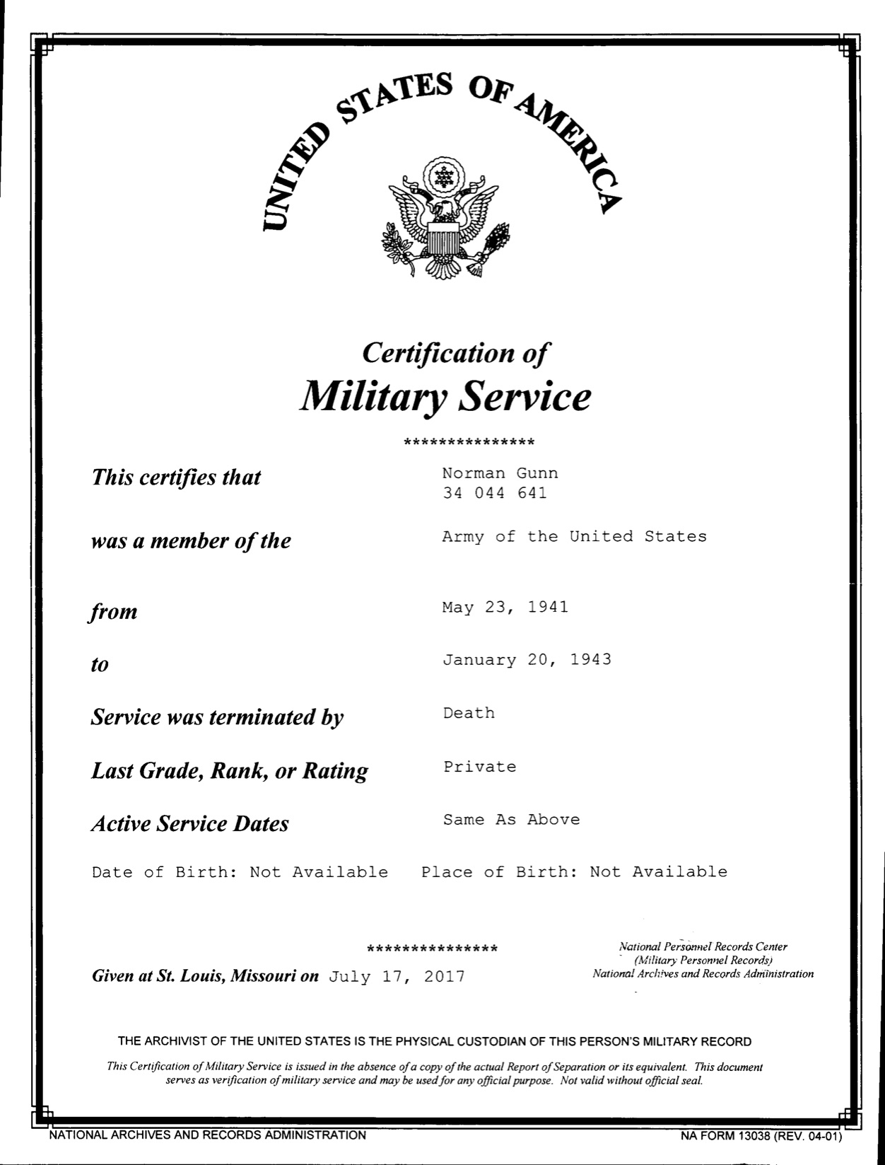 - Service Branch: Army/Army Air Forces
