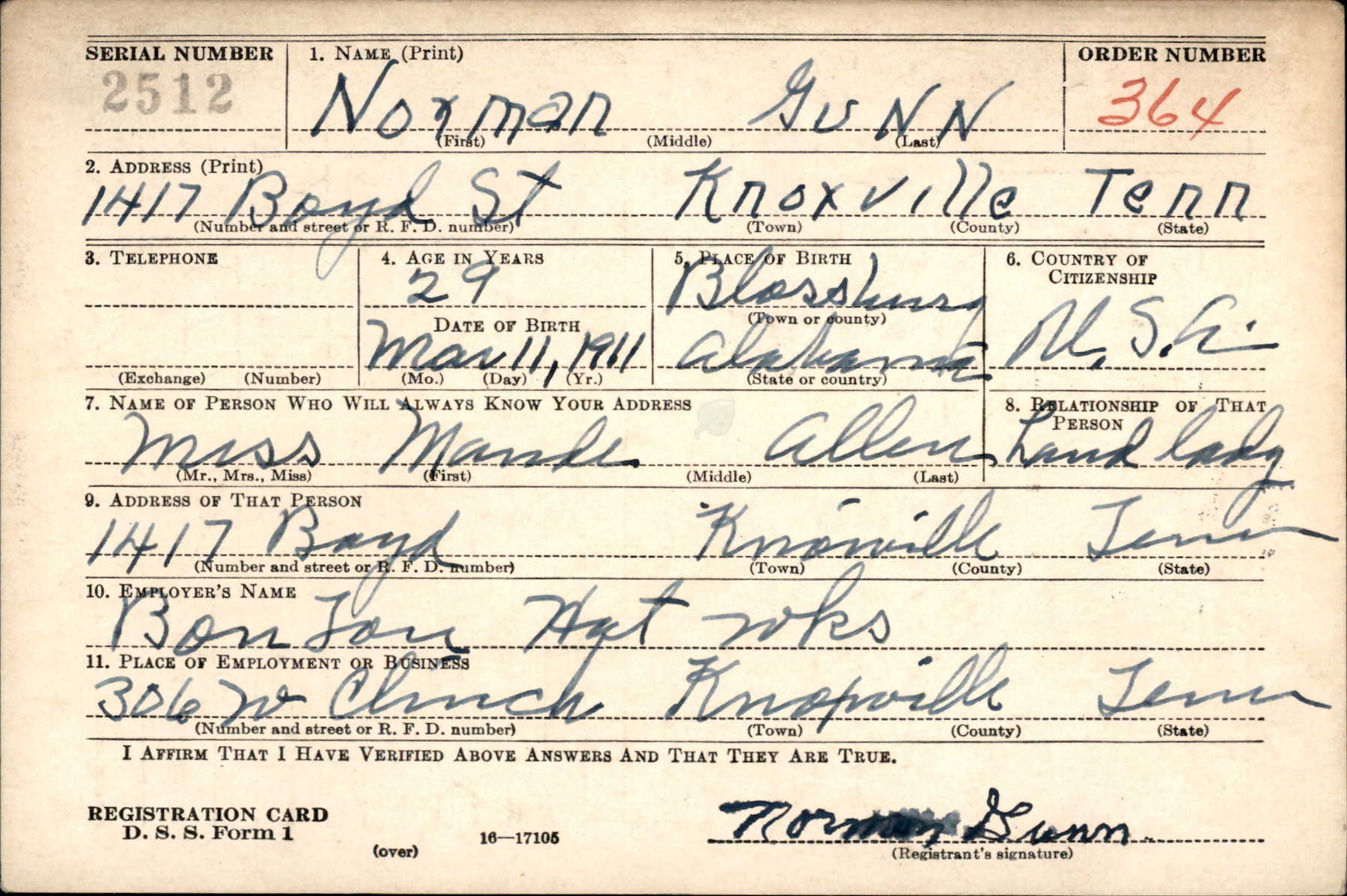 Norman Gunn was born on March 11, 1911 in Alabama, the son of Sam Gunn and Ella Jones.