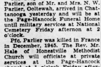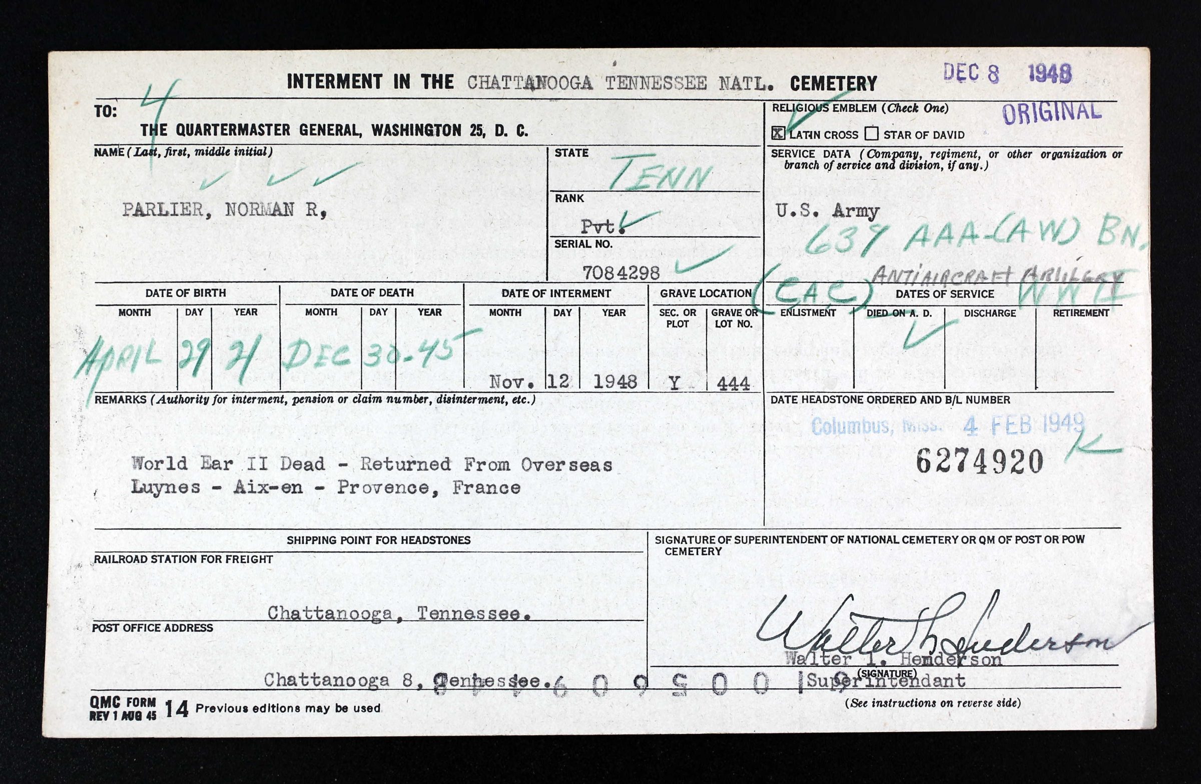 Norman Ray Parlier was born 29 April 1921 in Lincoln, North Carolina to Norman Wilson Parlier and Elizabeth Lee Hardin. He died 30 December 1945. Interment date was 12 November 1948 in Chattanooga National Cemetery, Chattanooga, Tennessee, Section Y Site 444.