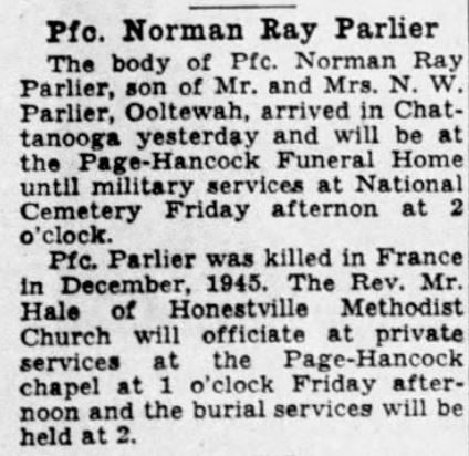 Norman Ray Parlier was born 29 April 1921 in Lincoln, North Carolina to Norman Wilson Parlier and Elizabeth Lee Hardin. He died 30 December 1945. Interment date was 12 November 1948 in Chattanooga National Cemetery, Chattanooga, Tennessee, Section Y Site 444.