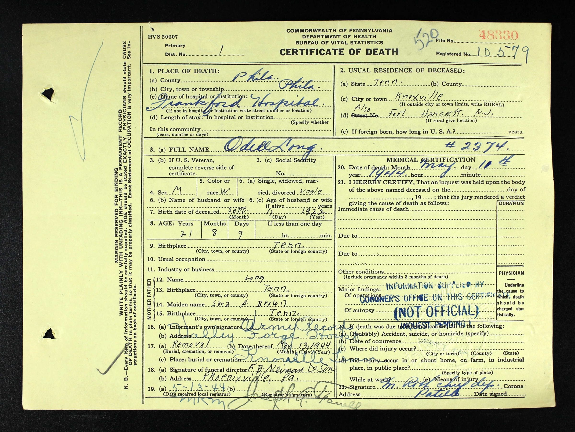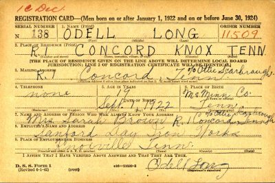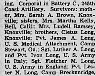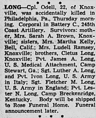 Cpl. Odell Long, 22, of Knoxville, was accidentally killed in Philadelphia, Pa., Thursday mroning. Corporal in Battery C, 245th Coast Artillery. Survivors: mother, Mrs. Sarah A. Brown, Knoxville,; sisters, Mrs. Martha Kelly, Bell, Calif.; Mrs. Ludell Ramsey, Knoxville; brothers, Cletus Long, U.S. Medical Attachment, Camp Stewart, Ga.; Sgt. Luther A. Long, and Pvt. Ivon Long, U.S. Army in Italy; Sgt Fletcher M. Long, U.S. Army in England; Pvt. Lester N. Long, Camp Breckenridge, Kentucky.