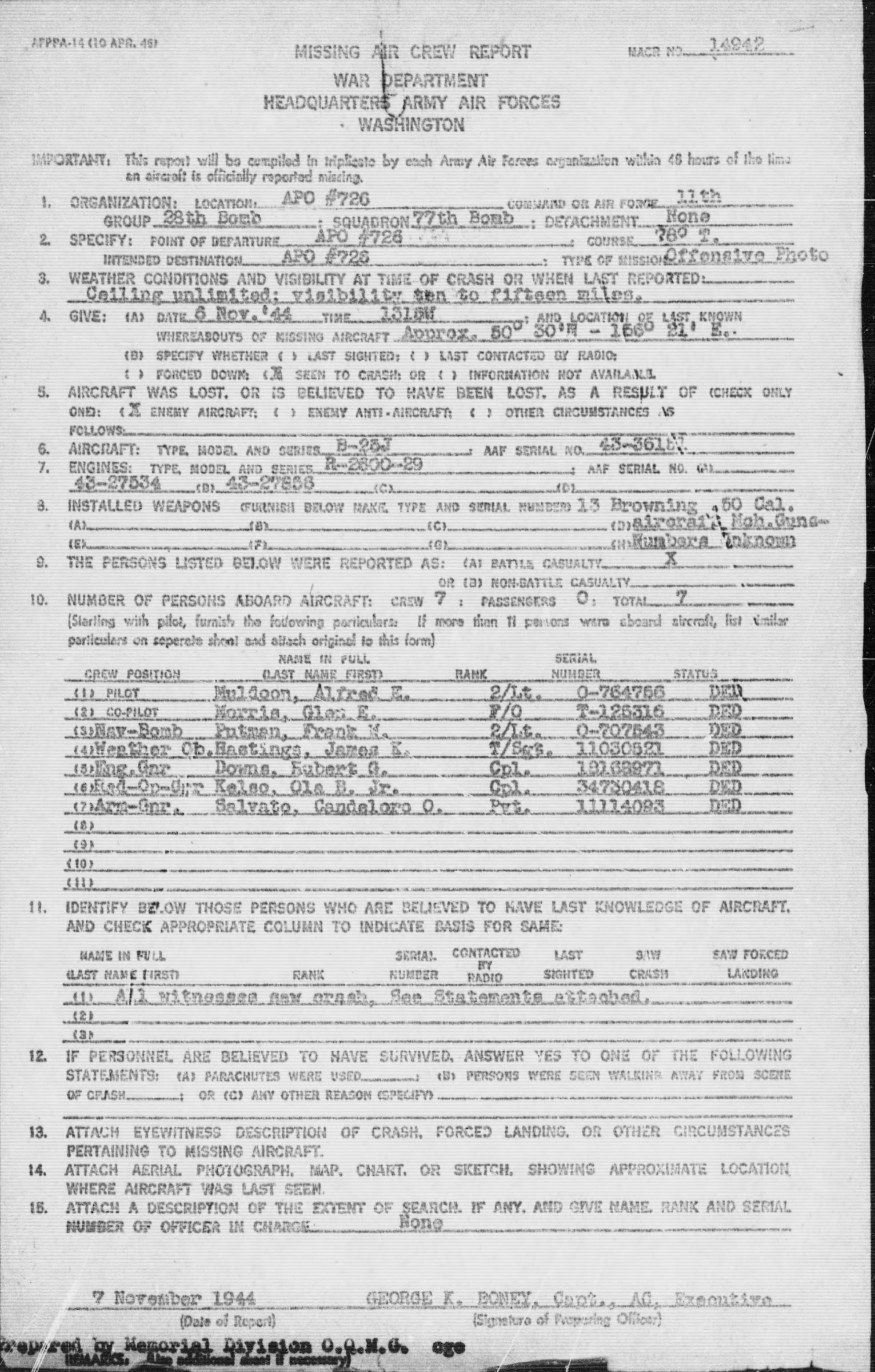 He was serving with the 77th Bomber Squadron, 28th Bomber Group at the time of his death.