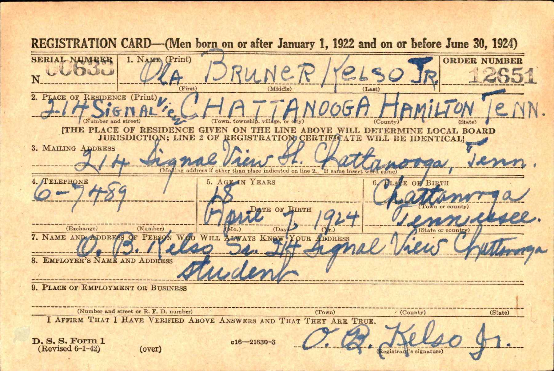 Cpl. Kelso entered duty with the air forces in April, 1943; received primary training at Scott Field, Ill., and won his gunnery wings at Buckingham Field, Fort Myers, Fla., in March, 1943. He went overseas two months later. A member of the While Oak Methodist Church, Copl. Kelso is survived by his wife; a two-year-old son Ronald Jerry; his parents; brother Raymond Kelso, and a sister, Miss Mildred Kelso, all of Chattanooga.
