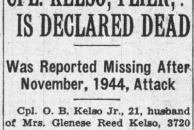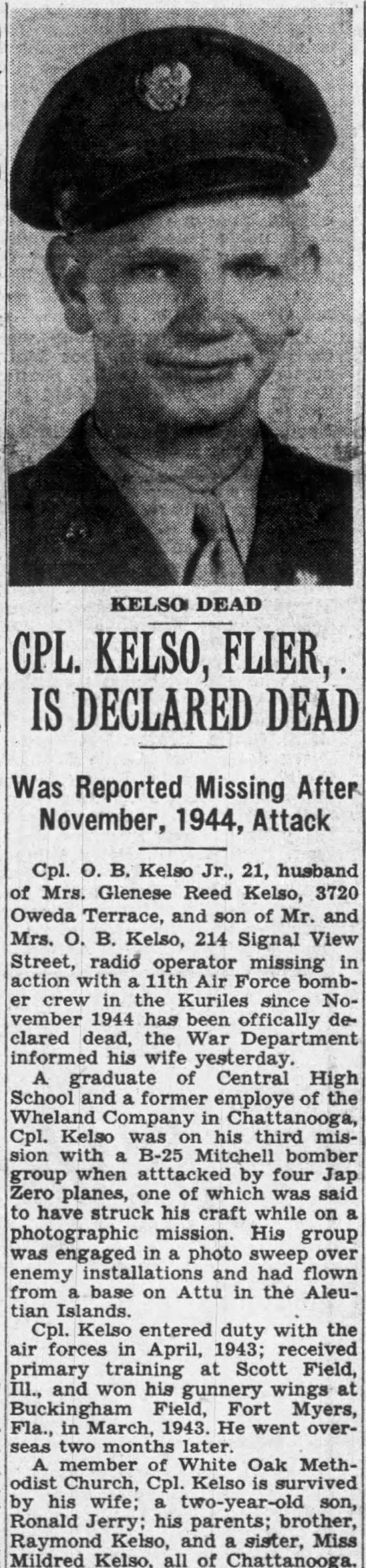 Cpl. O.B. Kelso Jr., 21, husband of Mrs. Glenese Reed Kelso, 3720 Oweda Terrace, and son of Mr. and Mrs. O.B. Kelso, 214 Signal View Street, radio operator missing in action with a 11th Air Force bombing crew in the Kuriles since November, 1944 has been officially declared dead, the War Department informed his wife yesterday. A graduate of Central High School and a former employe of the Wheland Company in Chattanooga, Cpl. Kelso was on his third mission with a B-25 Mitchell bomber group when attacked by four Jap Zero planes, one of which was said to have struck his craft while on a photographic mission. His group was engaged in a Photo sweep over enemy installations and had flown from a base on Attu in the Aleutian Islands.