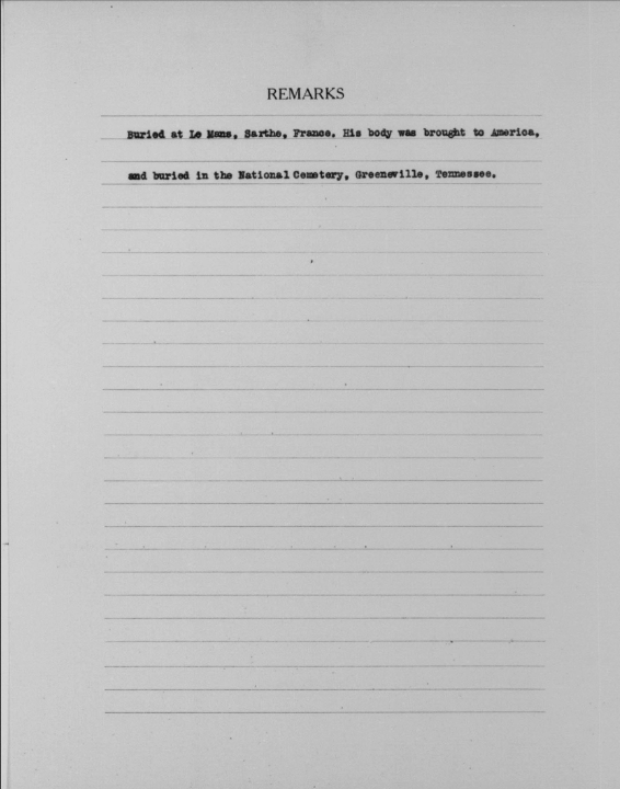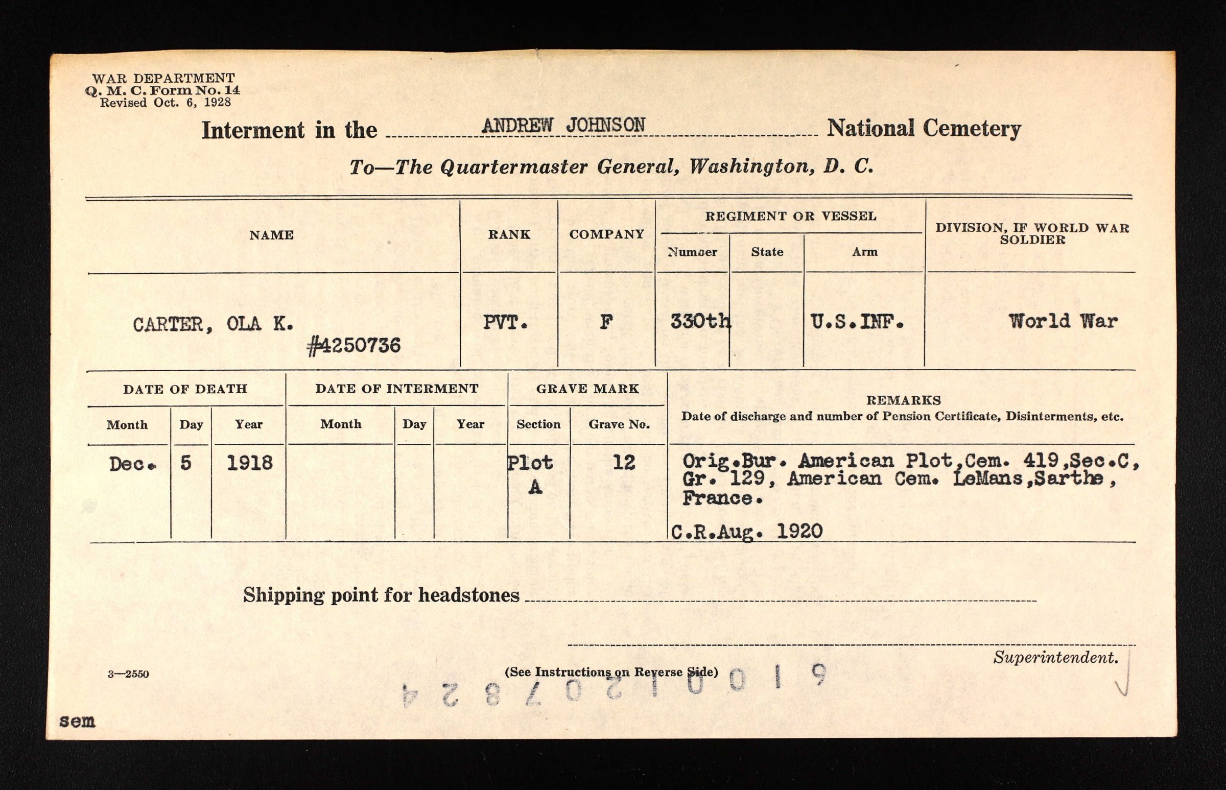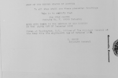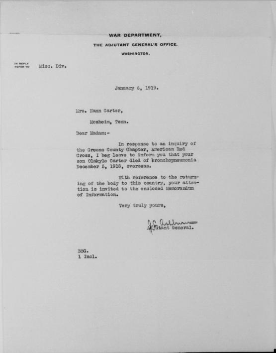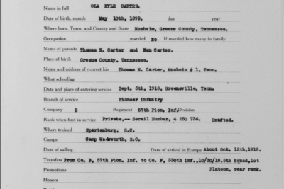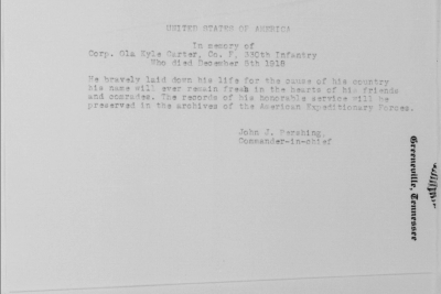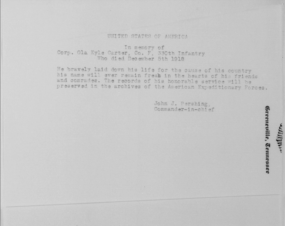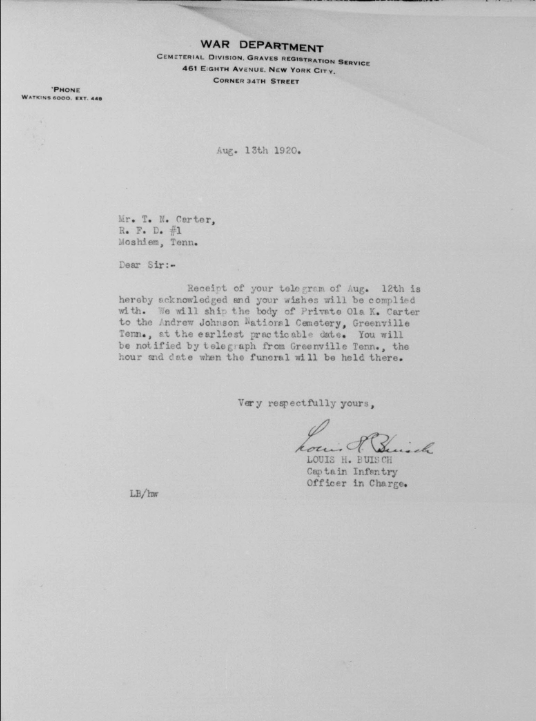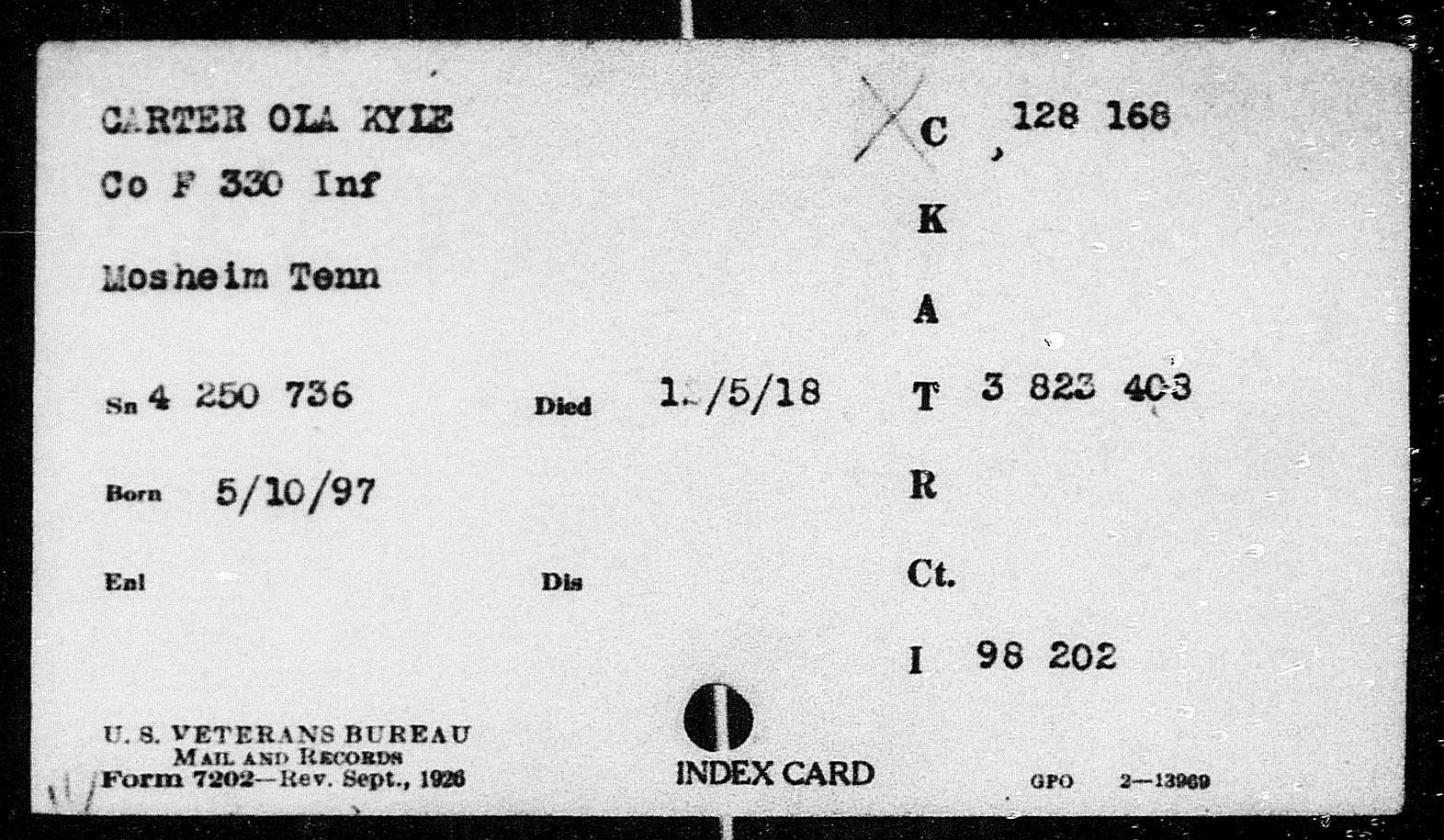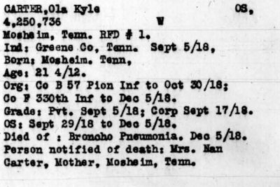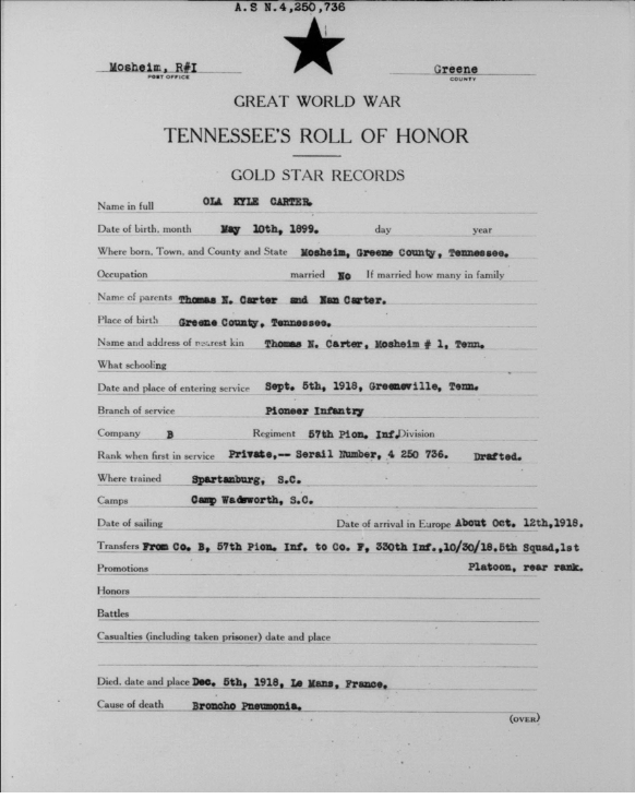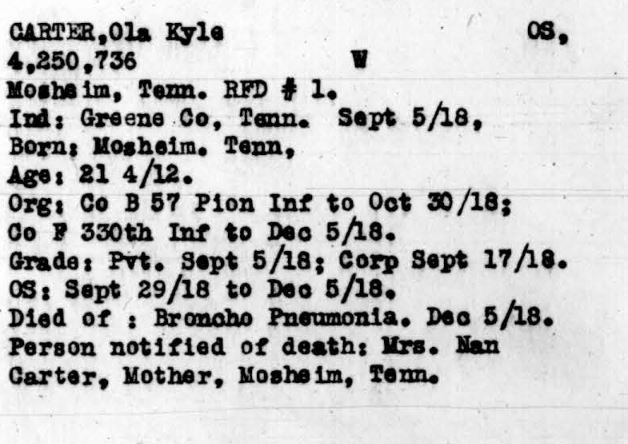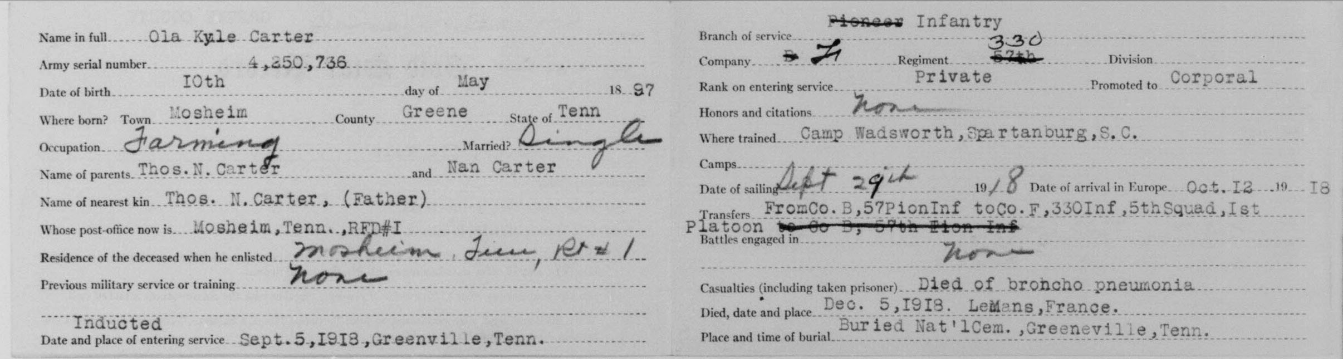 Ola Kyle Carter was born 10 May 1897, Mosheim, Tennessee to Thomas N. and Nan Carter. He died of broncho pneumonia at Le Mans in France on 5 December 1918 and was initially buried at the American Plot, American Cemetery, LeMans, Sarthe, France. Buried at Andrew Johnson National Cemetery, Greeneville, TN, A, 12.