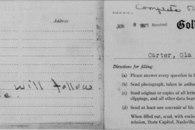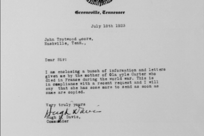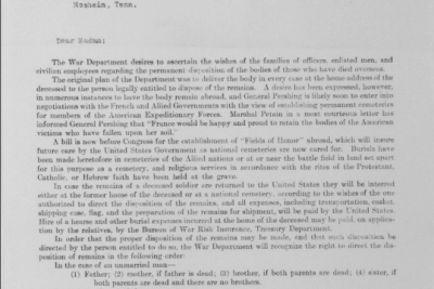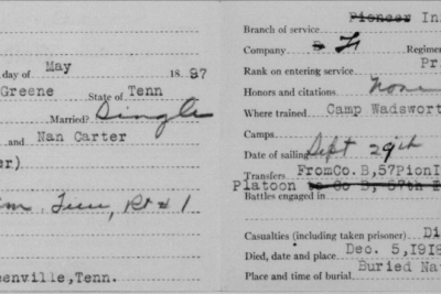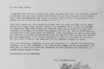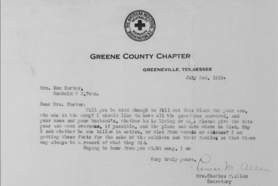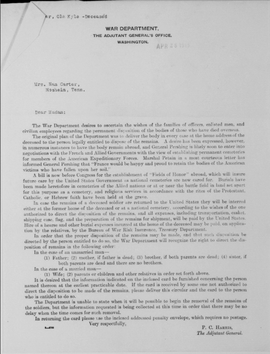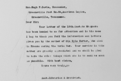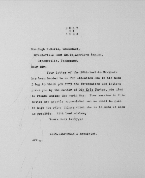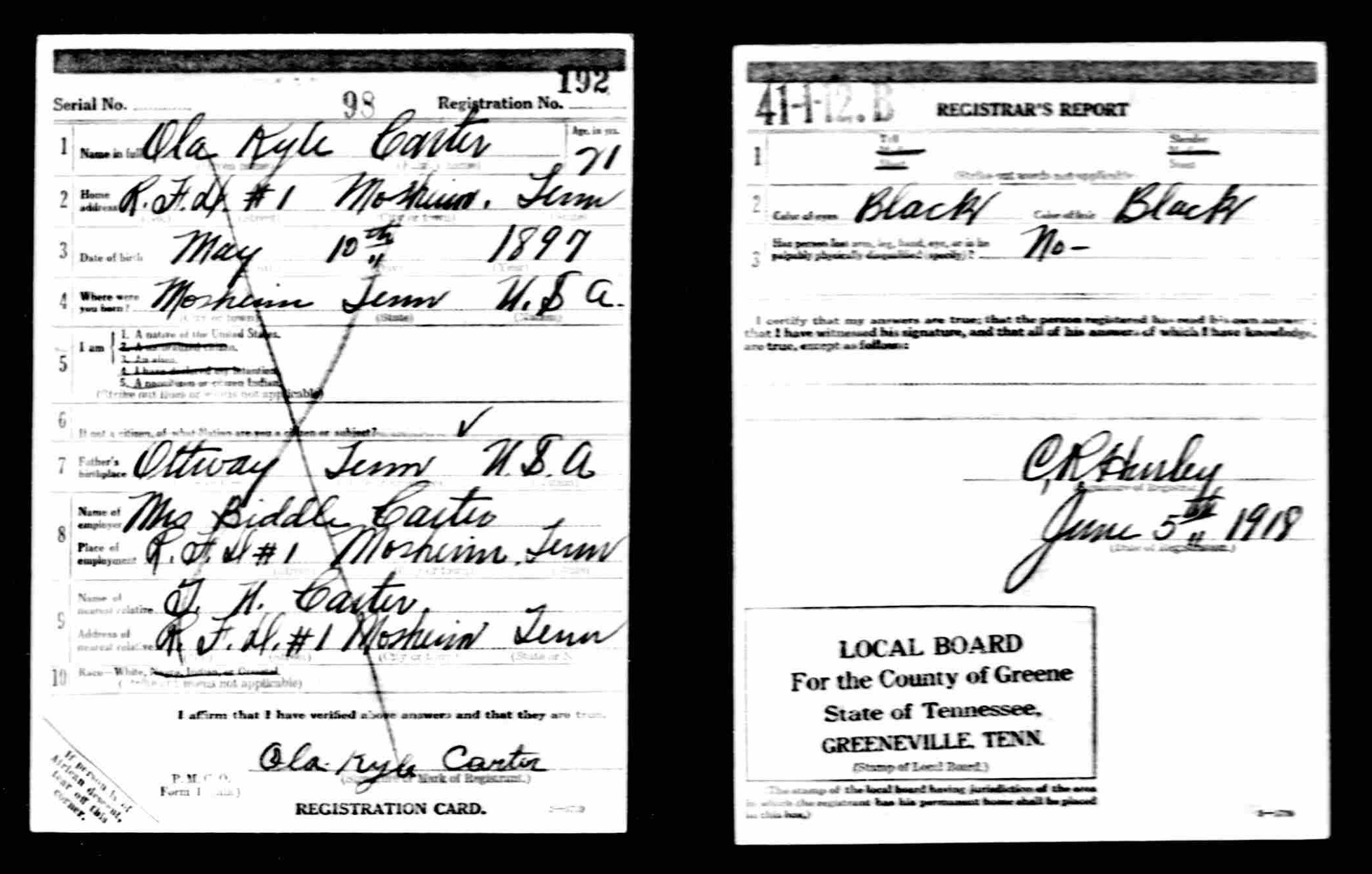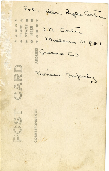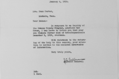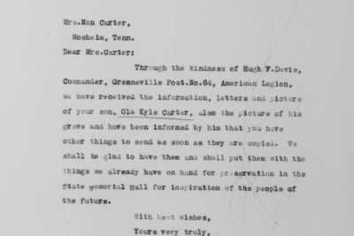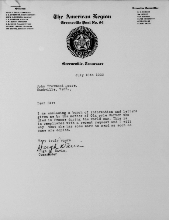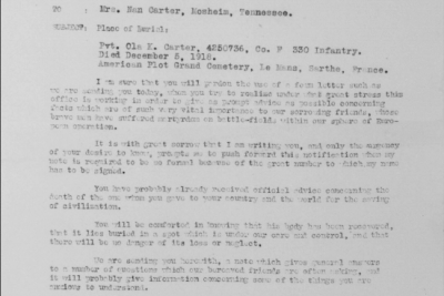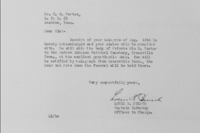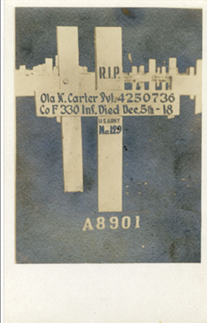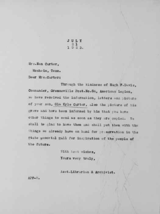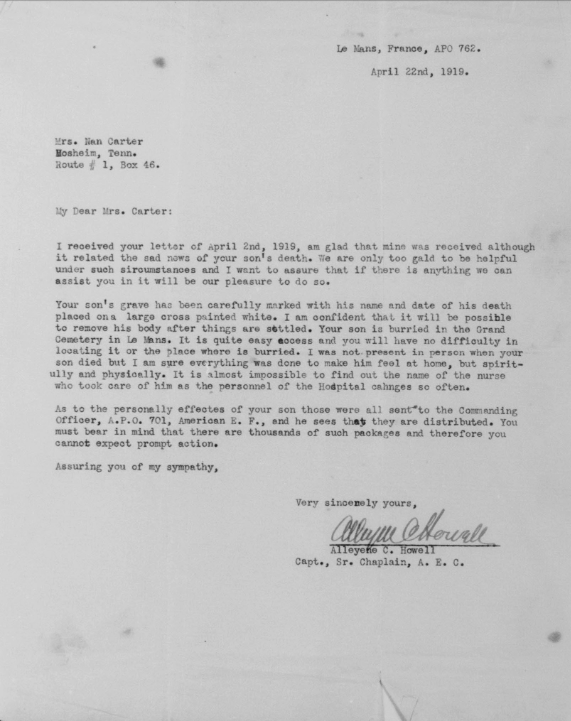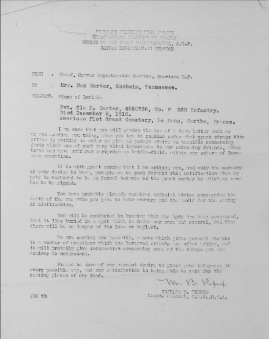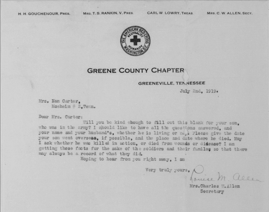 Ola Kyle Carter was born 10 May 1897, Mosheim, Tennessee to Thomas N. and Nan Carter. He died of broncho pneumonia at Le Mans in France on 5 December 1918 and was initially buried at the American Plot, American Cemetery, LeMans, Sarthe, France. Buried at Andrew Johnson National Cemetery, Greeneville, TN, A, 12.