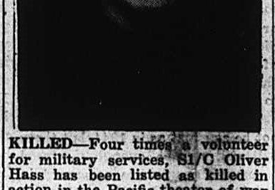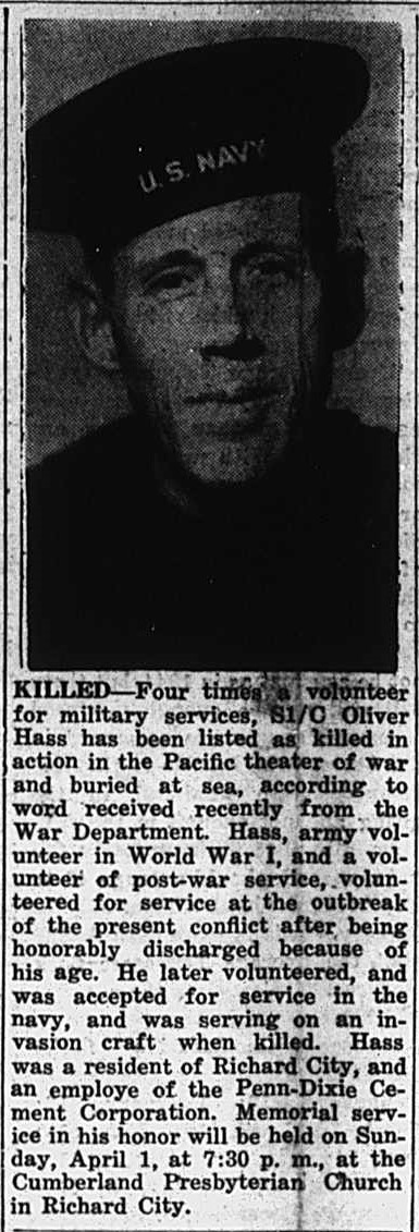 Four times a volunteer for military service, S1/C Oliver Hass has been listed as killed in action in the Pacific theater of war and buried at sea, according to word received recently from the War Department. Hass, army volunteer in World War I, and a volunteer of post-war service, volunteered at the outbreak of the present conflict after being honorably discharged because of his age. He later volunteered, and was accepted for service in the navy, and was serving on an invasion craft when killed. Hass was a resident of Richard City, and an employe of the Penn-Dixie Cement Corporation.