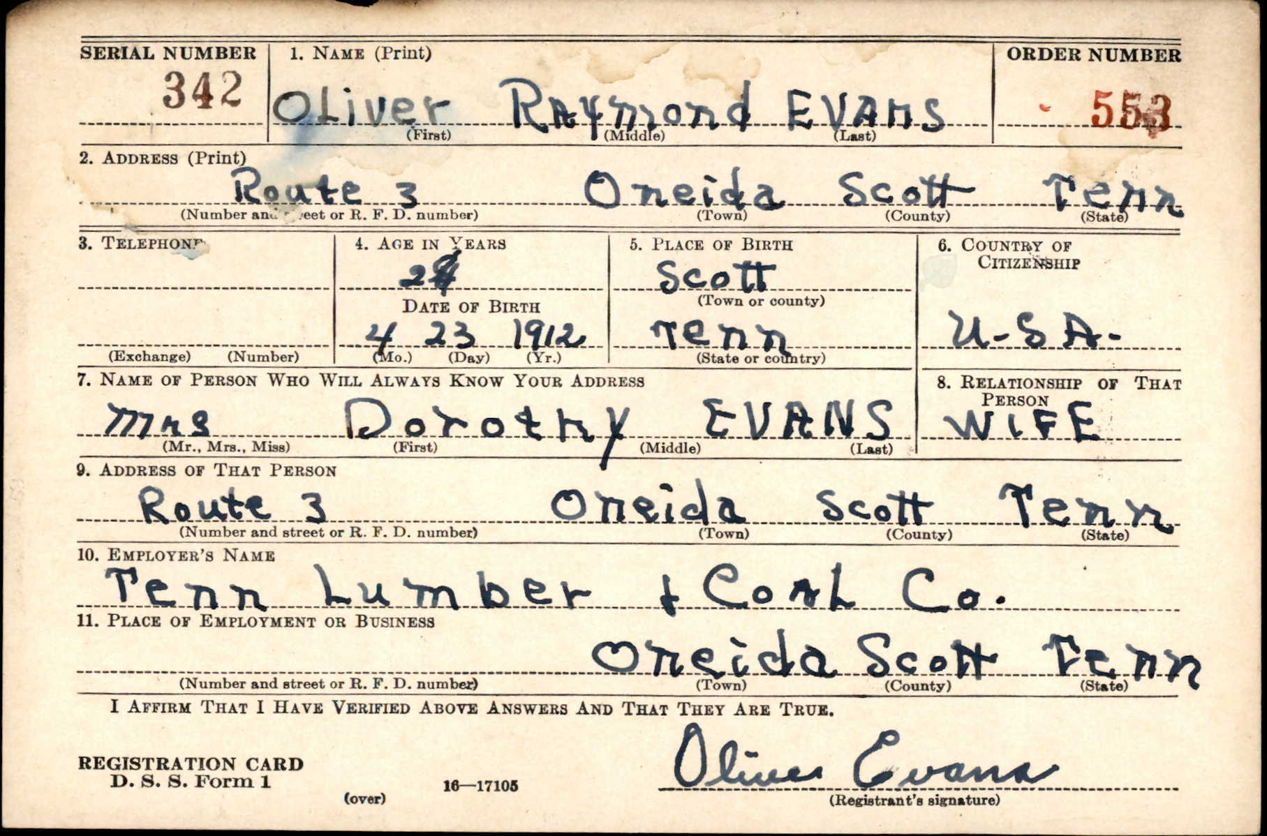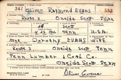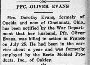 Oliver Raymond Evans was married to Dorothy ‘Dot’ Smith. He had been in the service about a year and was formerly employed by the Recto Molded Products, Inc., of Oakley.