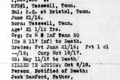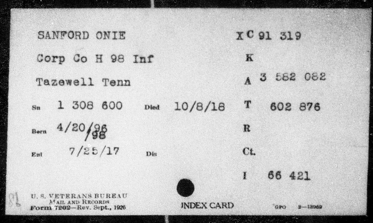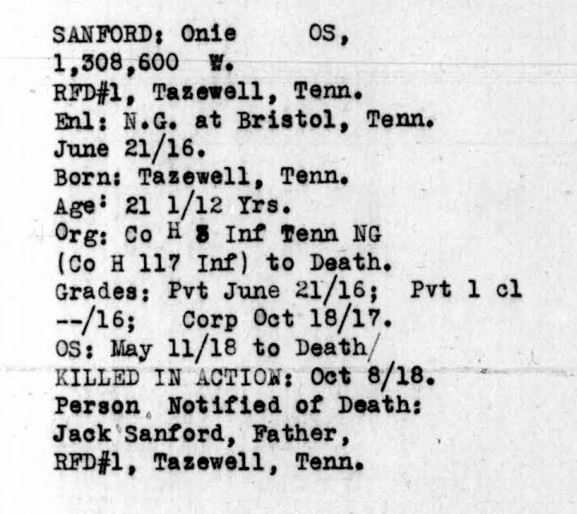 Onie Sanford was born 20 April 1898 in Tazewell, Claiborne County, Tennessee, son of Jacob Cansler Sanford and Mary Lou Leonard. Corporal Onie Sanford, was killed in action on the western front of France near Bony, Aisne on October 8, 1918.
