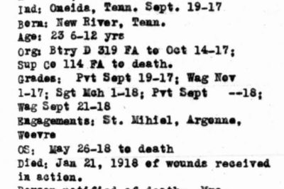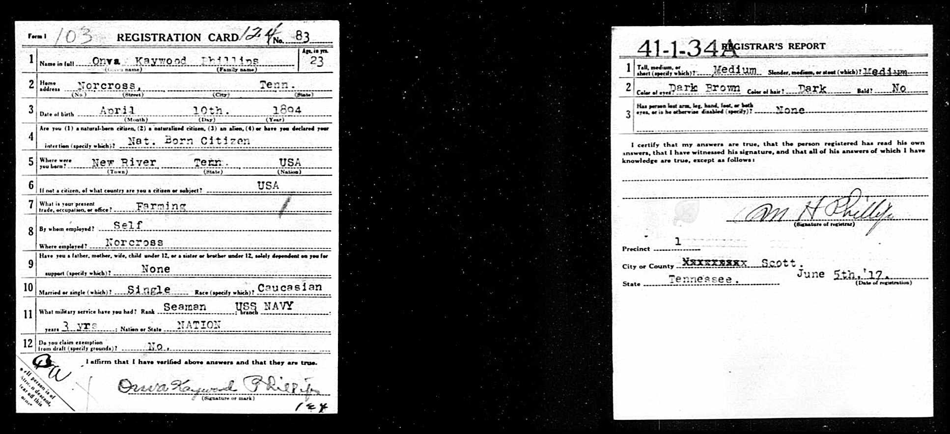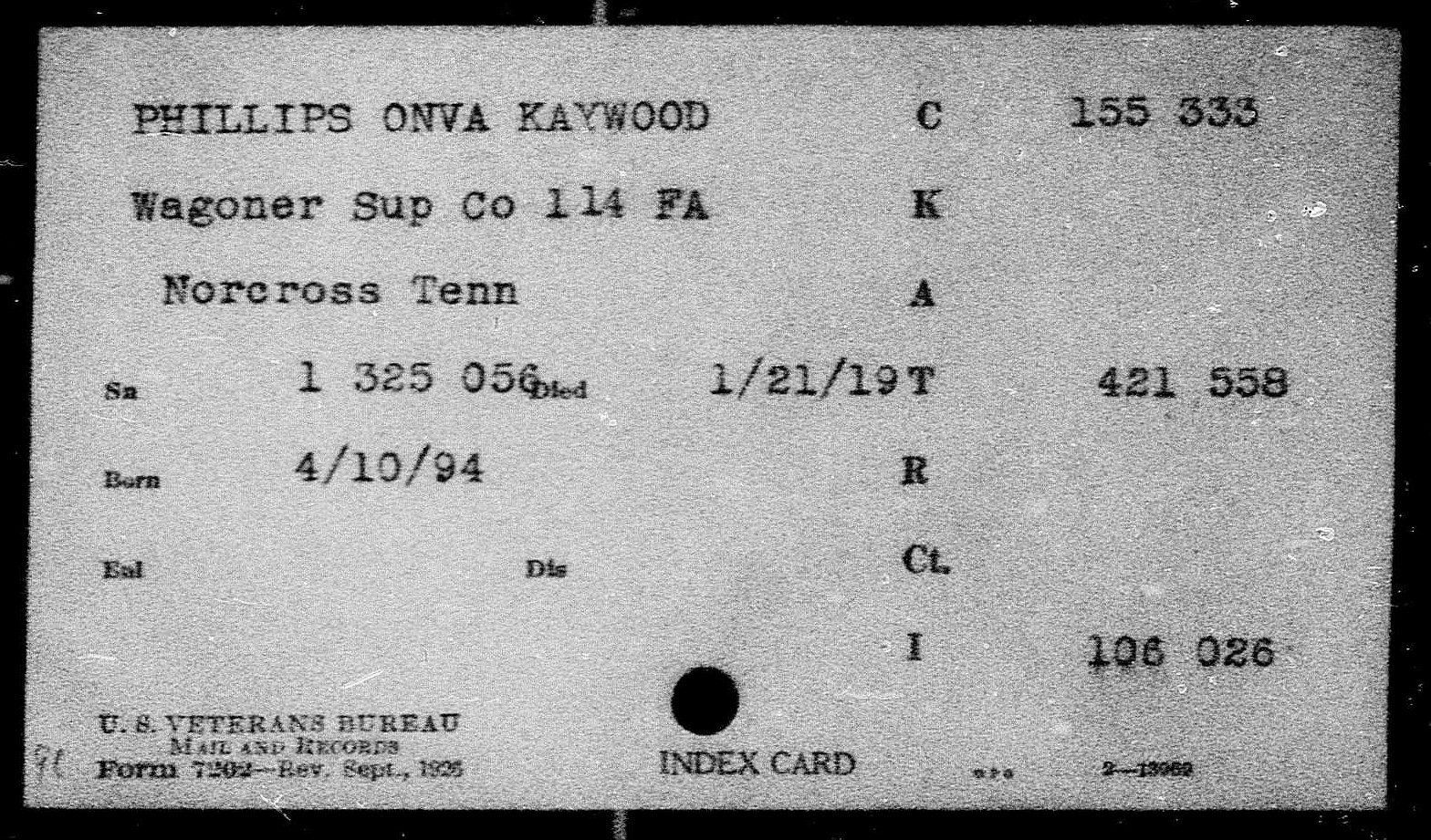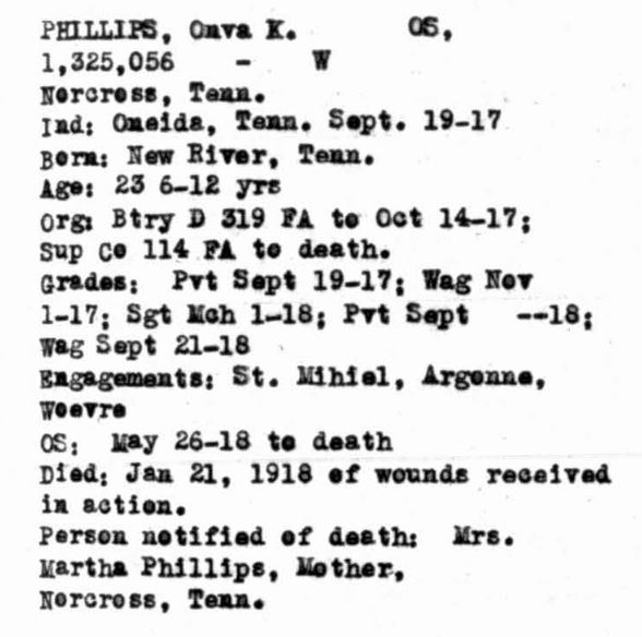 Onva Phillips entered the service at Camp Gordon on 18 September 1917. He is buried at Phillips Cemetery, Scott County, Tennessee.