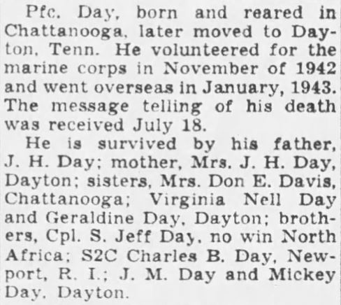 Pfc. Oral G. Day, 20, son of J.H. Day, employe of the Corley Manufacturing Company here, was killed in action in the Battle of Saipan. Pfc. Day, born and reared in Chattanooga, later moved to Dayton, Tennessee. He volunteered for the marine corps in November of 1942 and went overseas in January, 943. The message telling of his death was received July 18. He is survived by his parents; sisters, Mrs. Don E. Davis, Chattanooga; Virginia Nell Day and Geraldine Day, Dayton; brothers, Cpl. S. Jeff Day, no win North Africa; S2C Charles B. Day, Newport, R.I.; J.M. Day and Mickey Day.