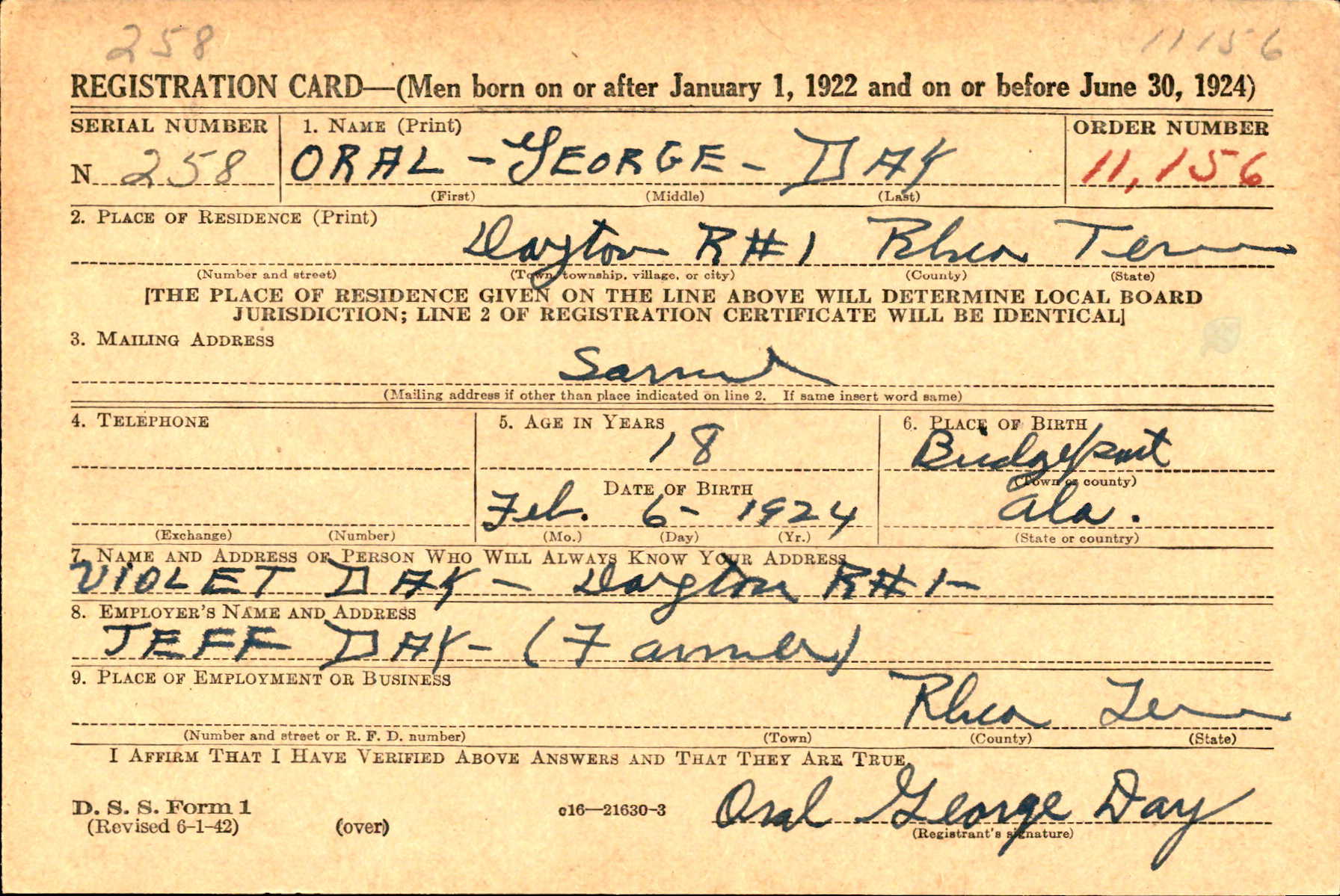 Oral George Day was born on 6 February 1924 in Bridgeport, Alabama to Thomas Jefferson H. “Jeff” Day and Roena Violet Stinnett.