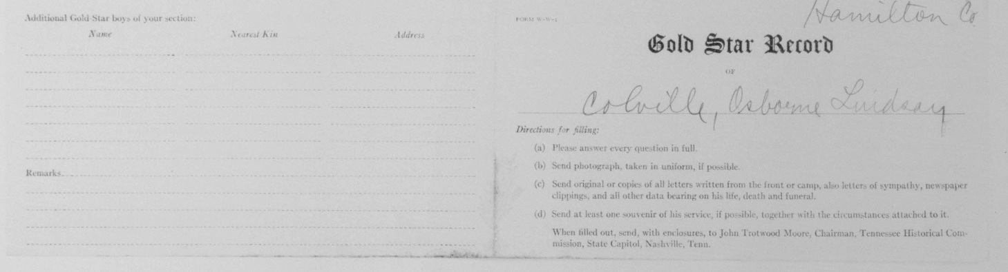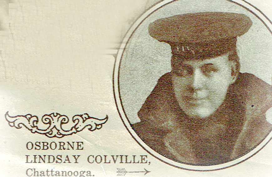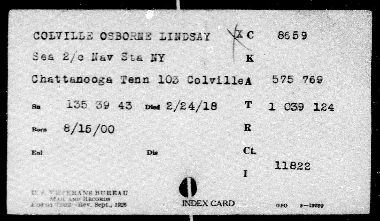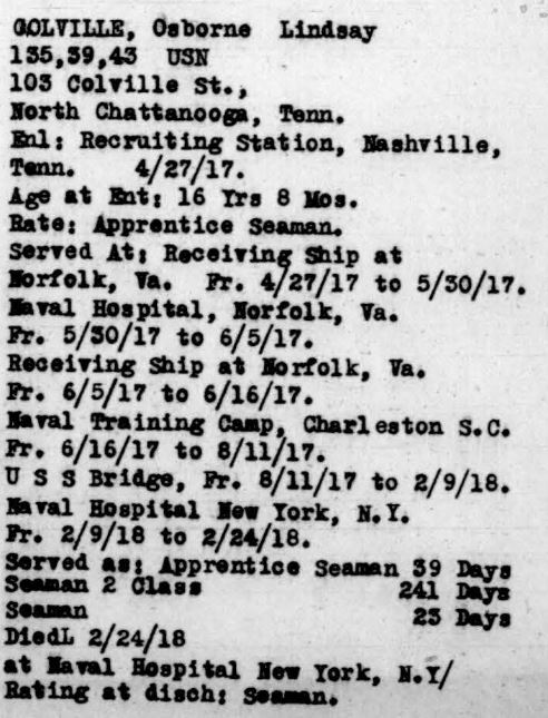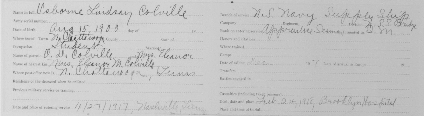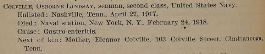 Seaman 2nd Class Osborne Lindsay Corville was born in March 1895, and was originally from Chattanooga, Tennessee. He was the son of O.C. and Eleanor Colville, and the brother of siblings Leonard, Elmore, and Hugh. He enlisted in the United States Navy for service in World War I on April 27, 1917 in Nashville, Tennessee. Prior to leaving for Europe, he was stationed in New York where he suffered from a bout of gastric illness, and passed away on February 24, 1918.