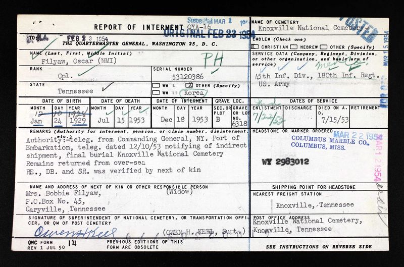 - Burial/Memorial Location: Knoxville National Cemetery, Knoxville, TN