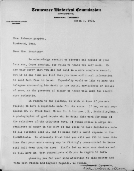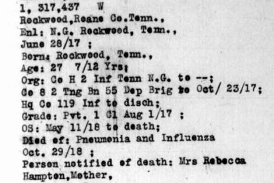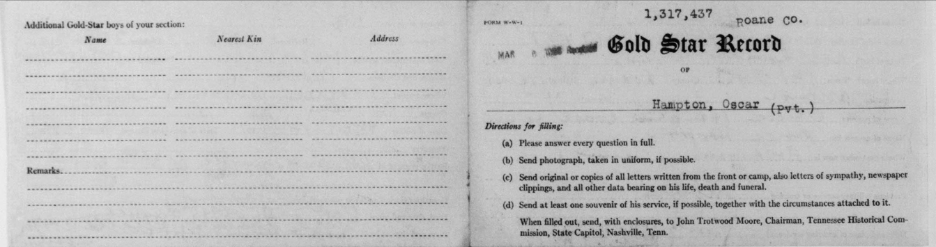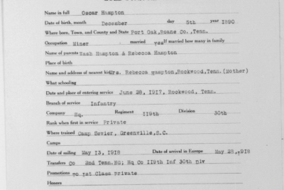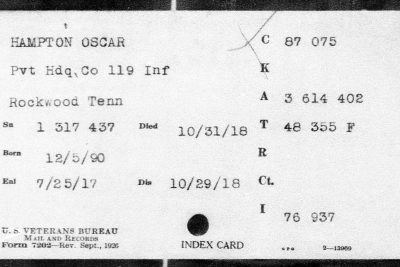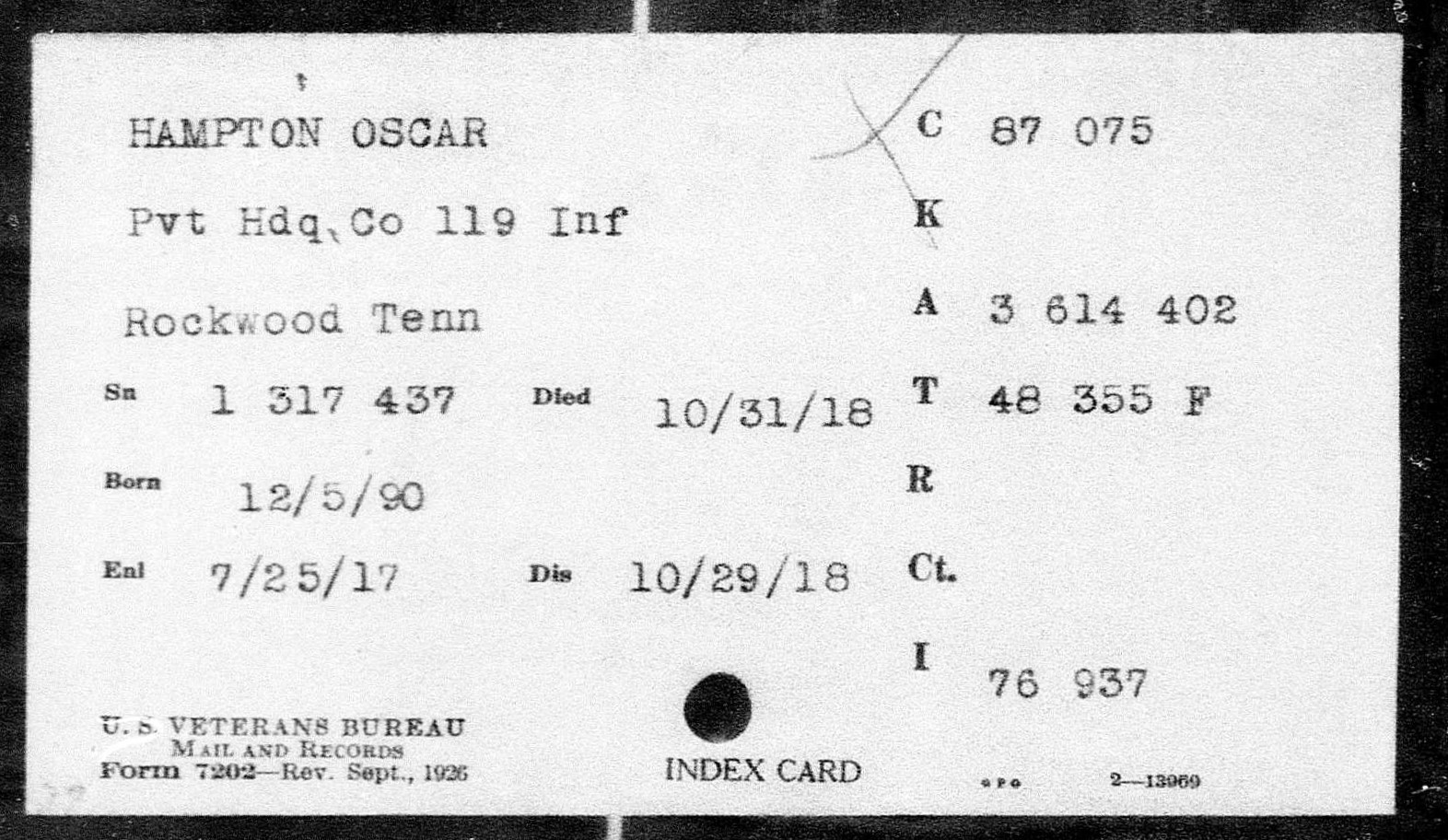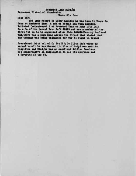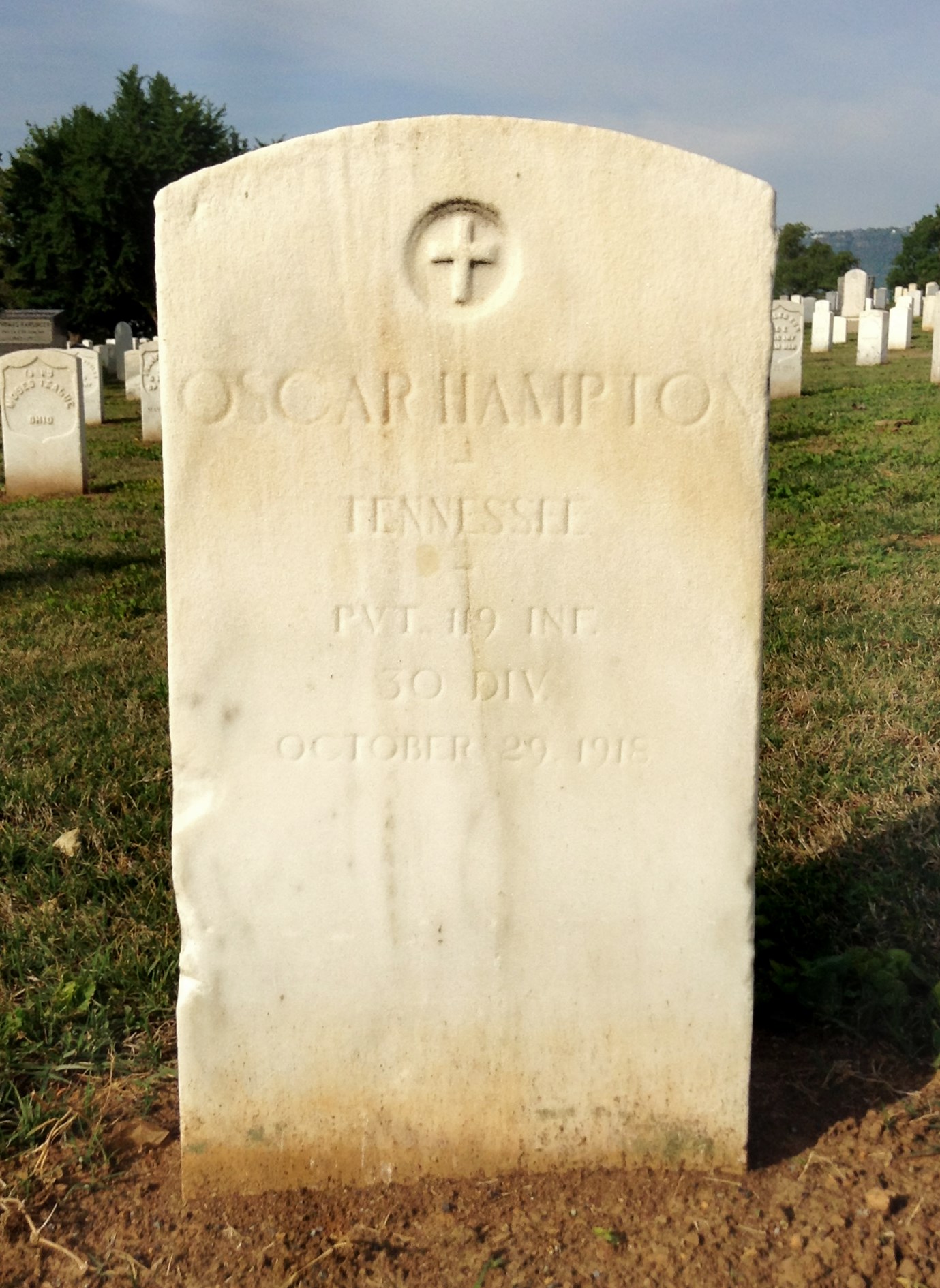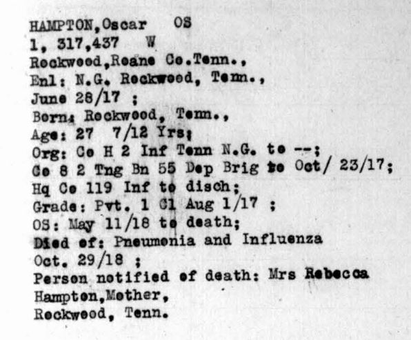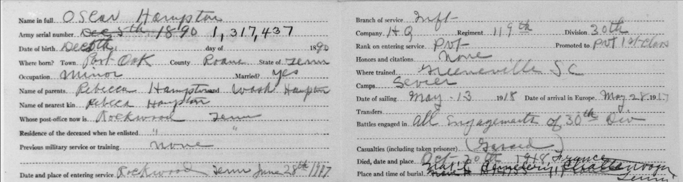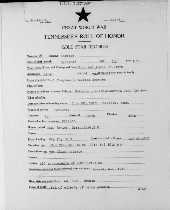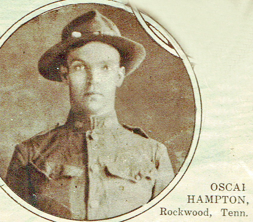 Oscar Hampton was born 5 December 1890 in Rockwood, Tennessee to James Washington Hampton and Rebecca C. Kirkland. He was gassed in October 1918, was send to hospital and died 29 October 1918 in France.