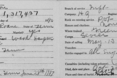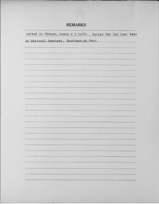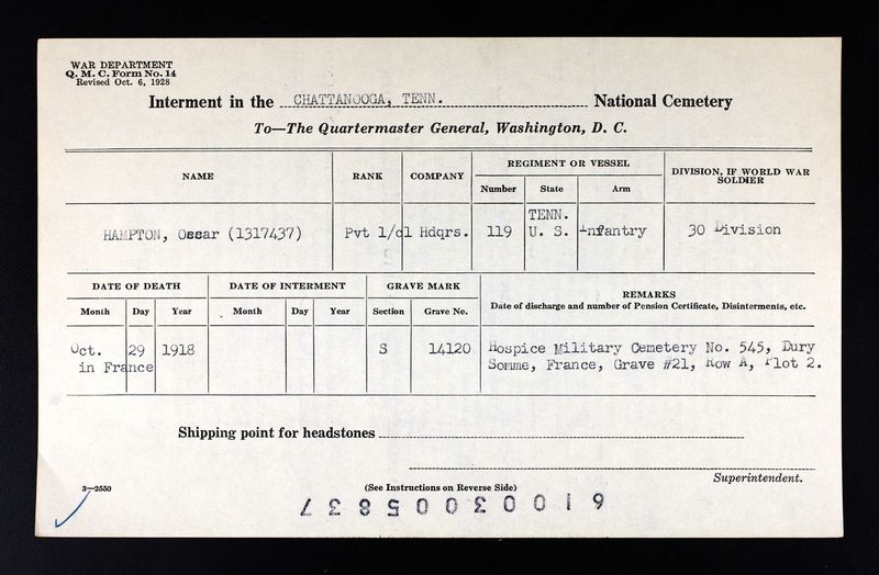 PFC Hampton was initially buried at Hospice Military Cemetery, Dury, Somme, France. He is buried at the Chattanooga National Cemetery, S, 14120.