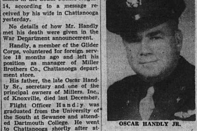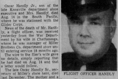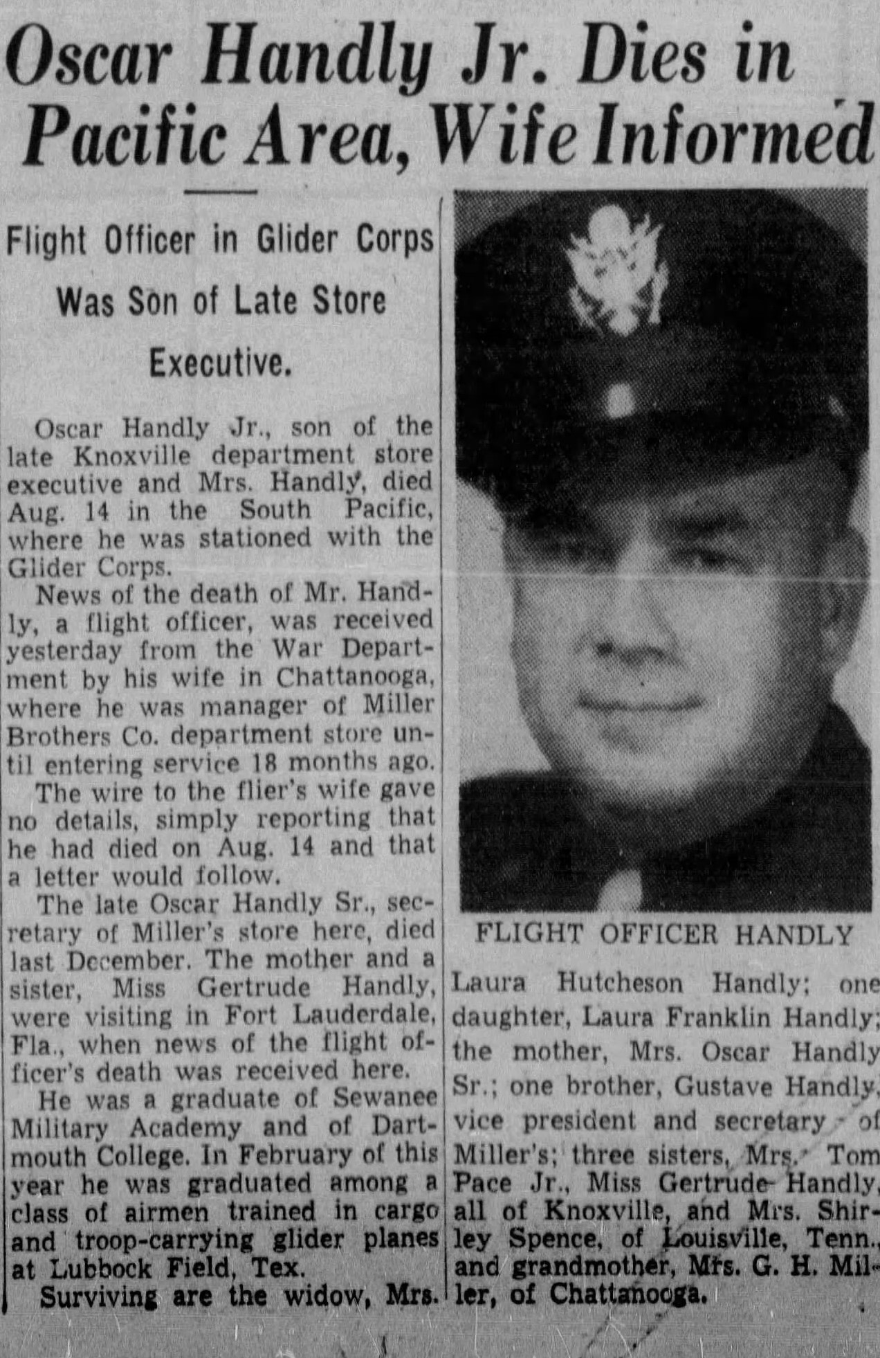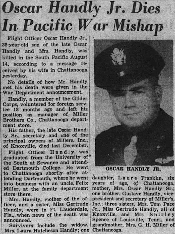 Oscar Handly Jr., son of the late Knoxville department store executive and Mrs. Handly, died Aug. 14 in the South Pacific where he was stationed with the Glider Corps. News of the death of Mr. Handly, a flight officer, was received yesterday from the War Department by his wife in Chattanooga, where he was manager of Miller Brothers Co. department store until entering service 18 months ago. The wire to the flier’s wife gave no details, simply reporting that he died on Aug. 14 and that a letter would follow. The late Oscar Handly Sr., secretary of Miller’s store here, died last December. The mothere, and a sister, Miss Gertrude Handly, were visiting in Fort Lauderdale, Fla., when news of the flight officer’s death was received here. He was a graduate of Sewanee Military Academy and of Dartmouth College. In February of this year he was graduated among a class of airmen trained in cargo and troop-carrying glider planes at Lubbock Field, Tex.