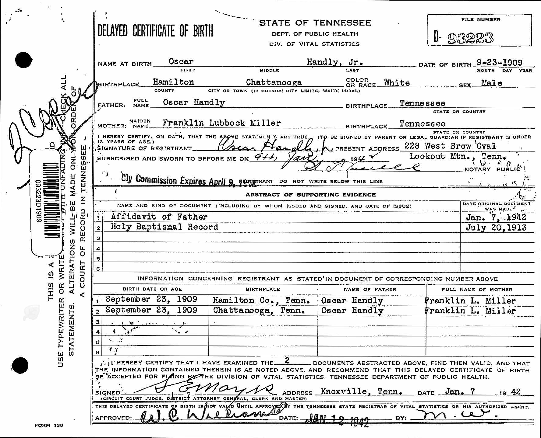 His father, the late Oscar Handly Sr., secretary and one of the principal owners of Miller, Inc., of Knoxville, died last December. Flight Officer handly was graduated from the University of the Southat Sewanee and attended Dartmouth College. He went to Chattanooga shortly after attending Dartmouth, where he went into business with an uncle, Felix Miller, at the family department store there. Mrs. Handly, mother of the officer, and a sister, Miss Gertrude Handly were in Ft. Lauderdale, Fla., when the news of the death was announced. Survivors include the widow, Mrs. Laura Hutcheson Handly; one daughter, Laura Franklin, six years of age, of Chattanooga, mother Mrs. Oscar Handly Sr.; one brother, Gustave Handly, vice-president and secretary of Miller’s Inc., Miss Gertrude Handly, all of Knoxville, and Mrs. Shirley Spence of Louisville, Tenn., and grandmother, Mrs. G.H. Miller of Chattanooga.