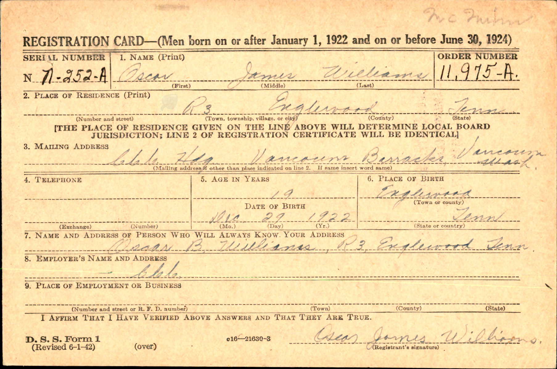 Oscar James Williams was the son of Oscar Bennett Williams. He was reported missing in 1943 and officially declared dead in 1944.