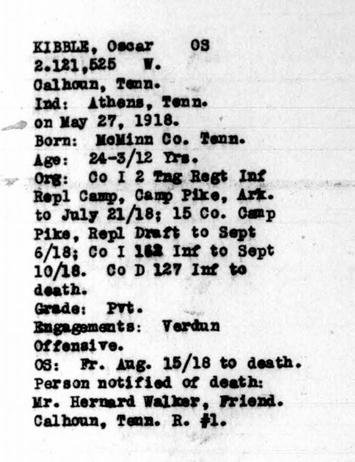 Pvt Kibble died in France on 18 October 1918 and is buried at Calhoun Community Cemetery, Calhoun, McMinn County, Tennessee.