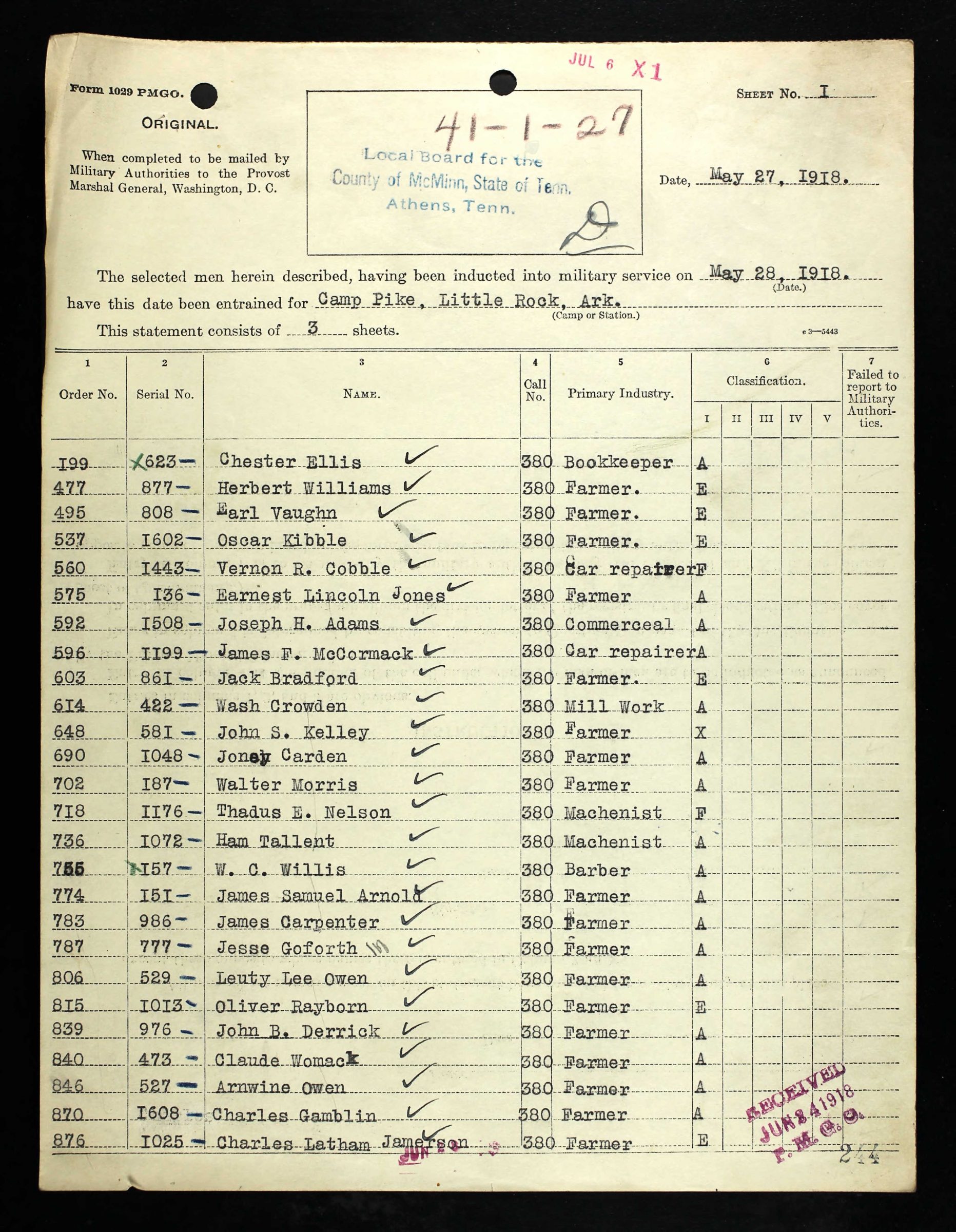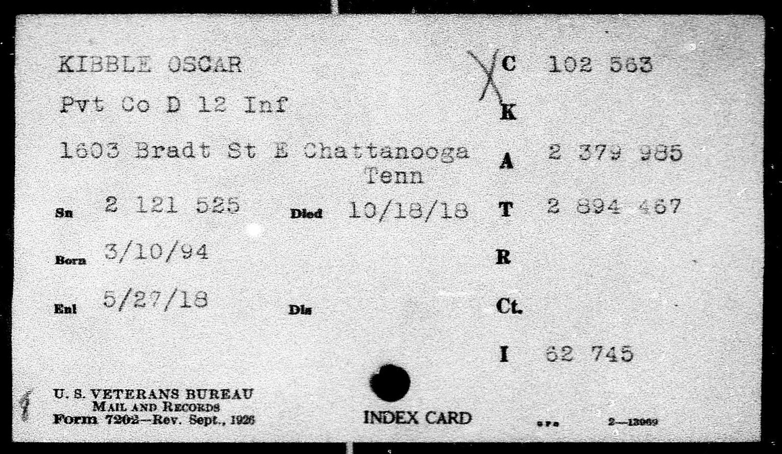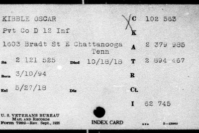 Oscar Kibble was a farmer before his induction into military service on 28 May 1918 at Camp Pike, Little Rock, Arkansas.