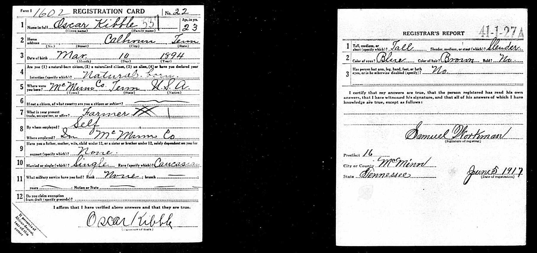 Oscar Kibble was born 10 March 1894, McMinn County, Tennessee, to James Franklin Kibble and Sarah Catherine Jones.