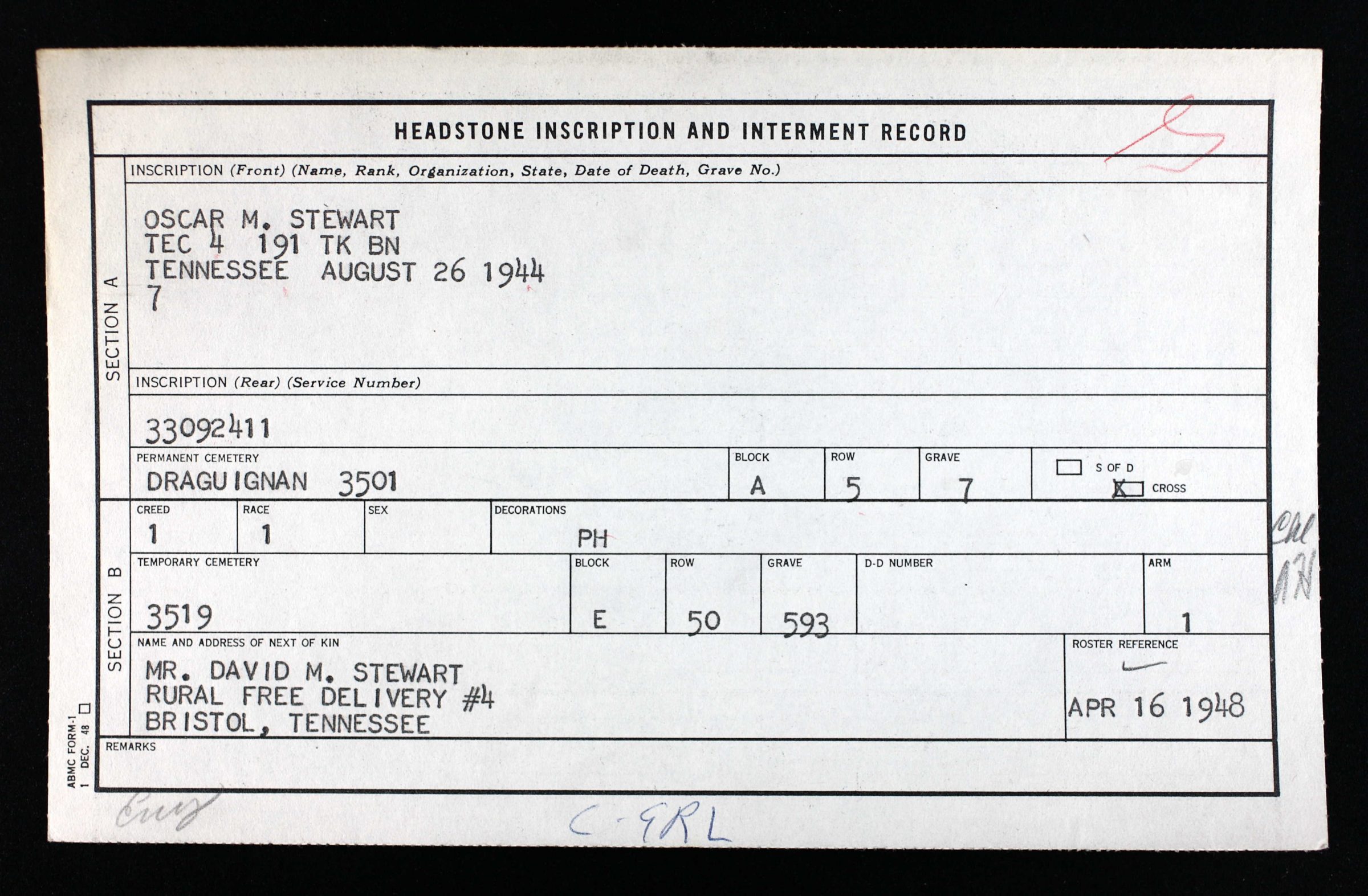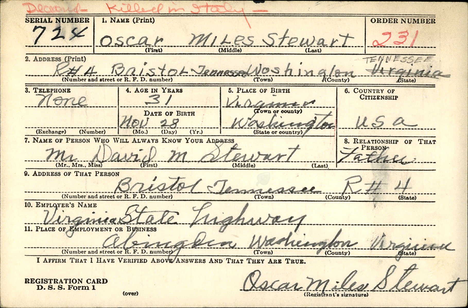 Oscar Miles Stewart was born in Virginia. Son of David Malville Stewart and Harriet Olivia Phillips. Sgt Stewart entered the service May 1, 1942 and in January 1943 was married to Sallie Mae Hill.