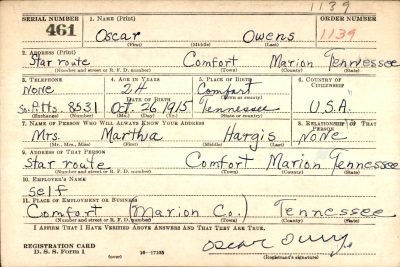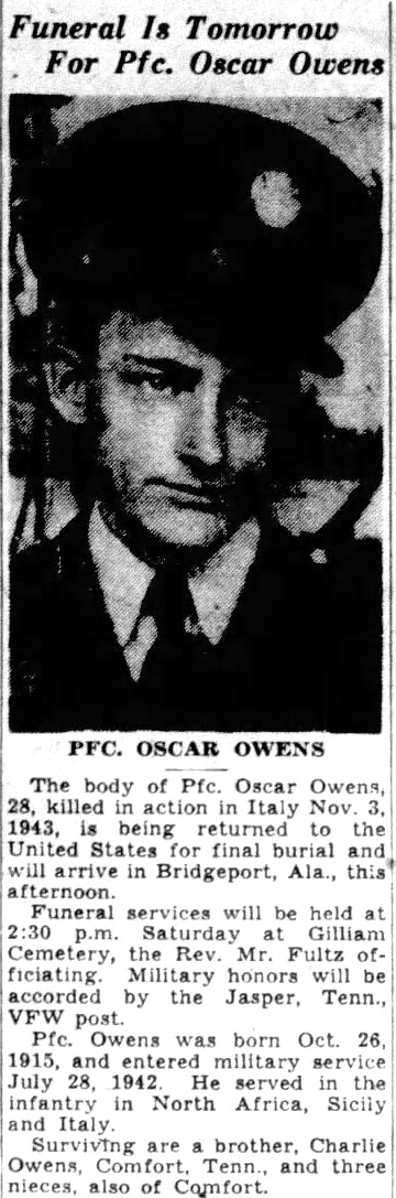 The body of Pfc. Oscar Owens, 28, killed in action in Italy Nov. 3, 1943, is being returned to the United States for final burial and will arrive in Bridgeport, Ala., this afternoon. Funeral services will be held at Gilliam Cemetery. Pfc. Owens was born Oct. 26, 1915, and entered military service July 28, 1942. He served in the infantry in North Africa, Sicily and Italy. Surviving are a brother, Charlie Owens, Comfort, Tenn., and three nieces, also of Comfort.