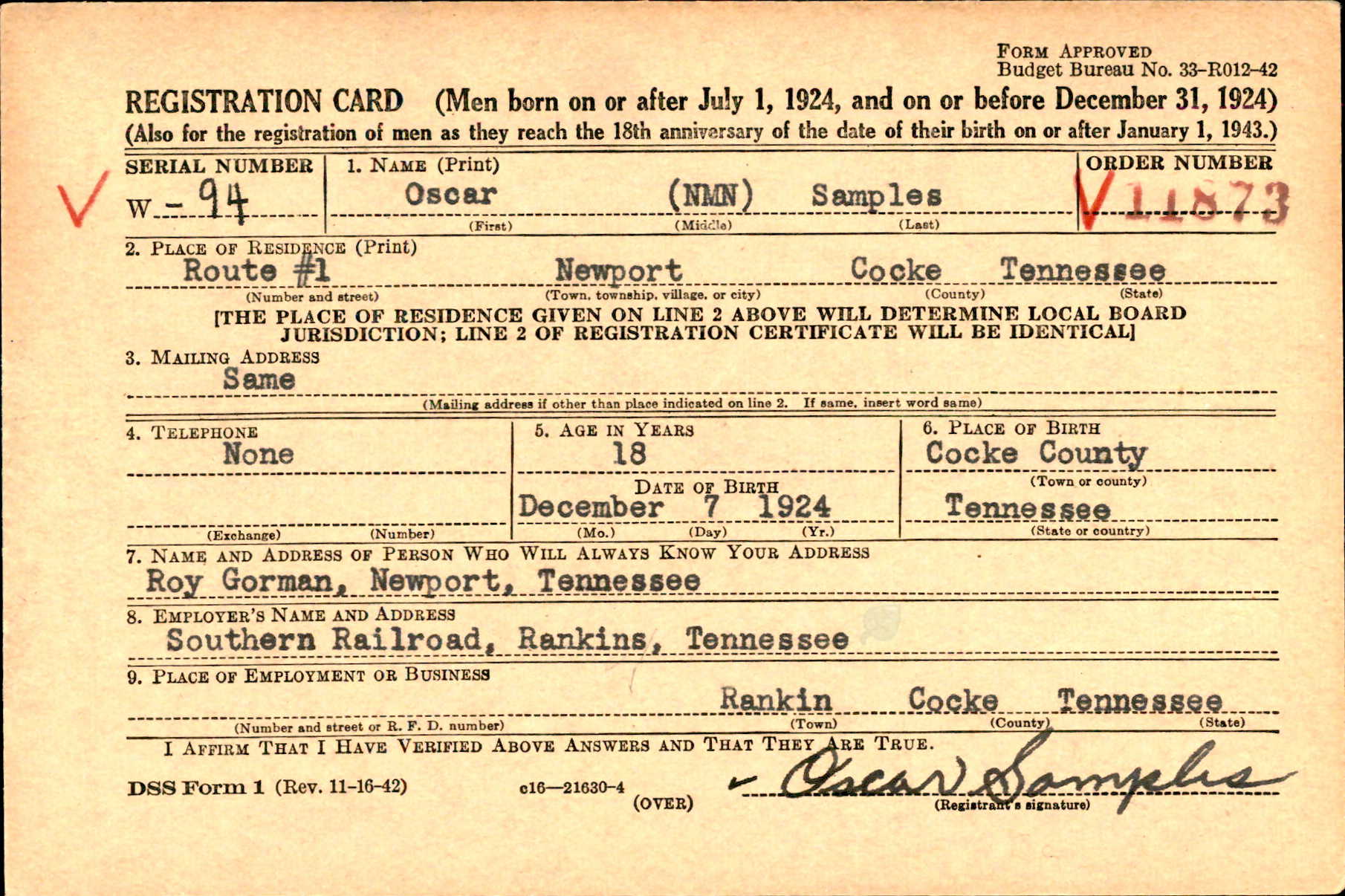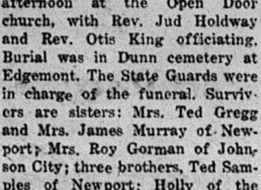 Oscar Samples, A.M.M. 3C, age 19, was killed in a plane collision near Oak, Ala., April 7. Funeral services were held Thursday afternoon at the Open Door church, with Rev. Jud Holdway and Rev. Otis King officiating. Burial was in Dunn cemetery at Edgemont. The State Guards were in charge of the funeral. Survivors are sisters Mrs. Ted Gregg and Mrs. James Murray of Newport Mrs. Roy Gorman of Johnson City three brothers, Ted Samples of Newport Holly of the Army Air Corps, Camp Luna, New Mexico, and Lester of the Army somewhere in England.