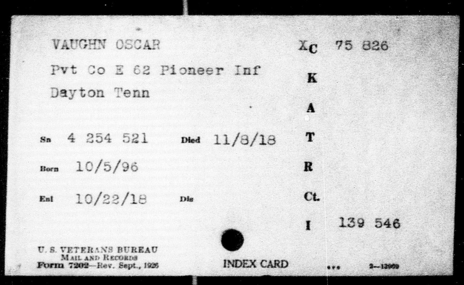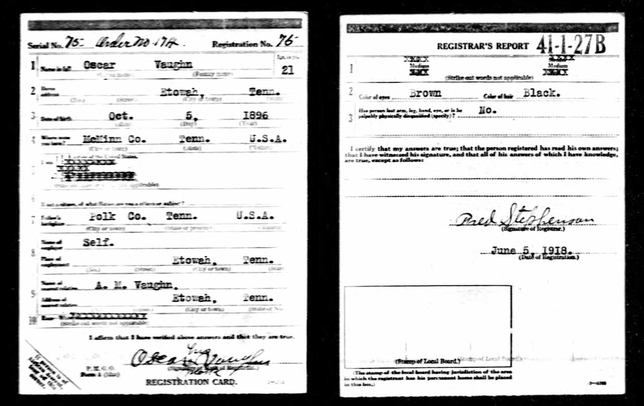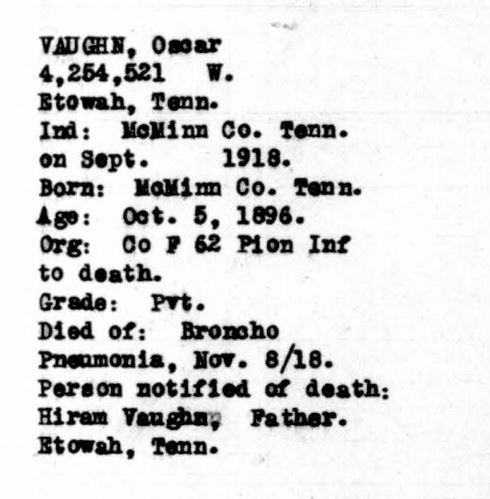 Oscar W. Vaughn was born 5 October 1896, McMinn County, Tennessee, son of Hiram Vaughn