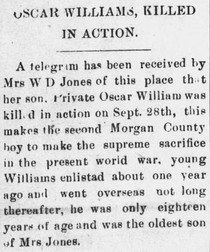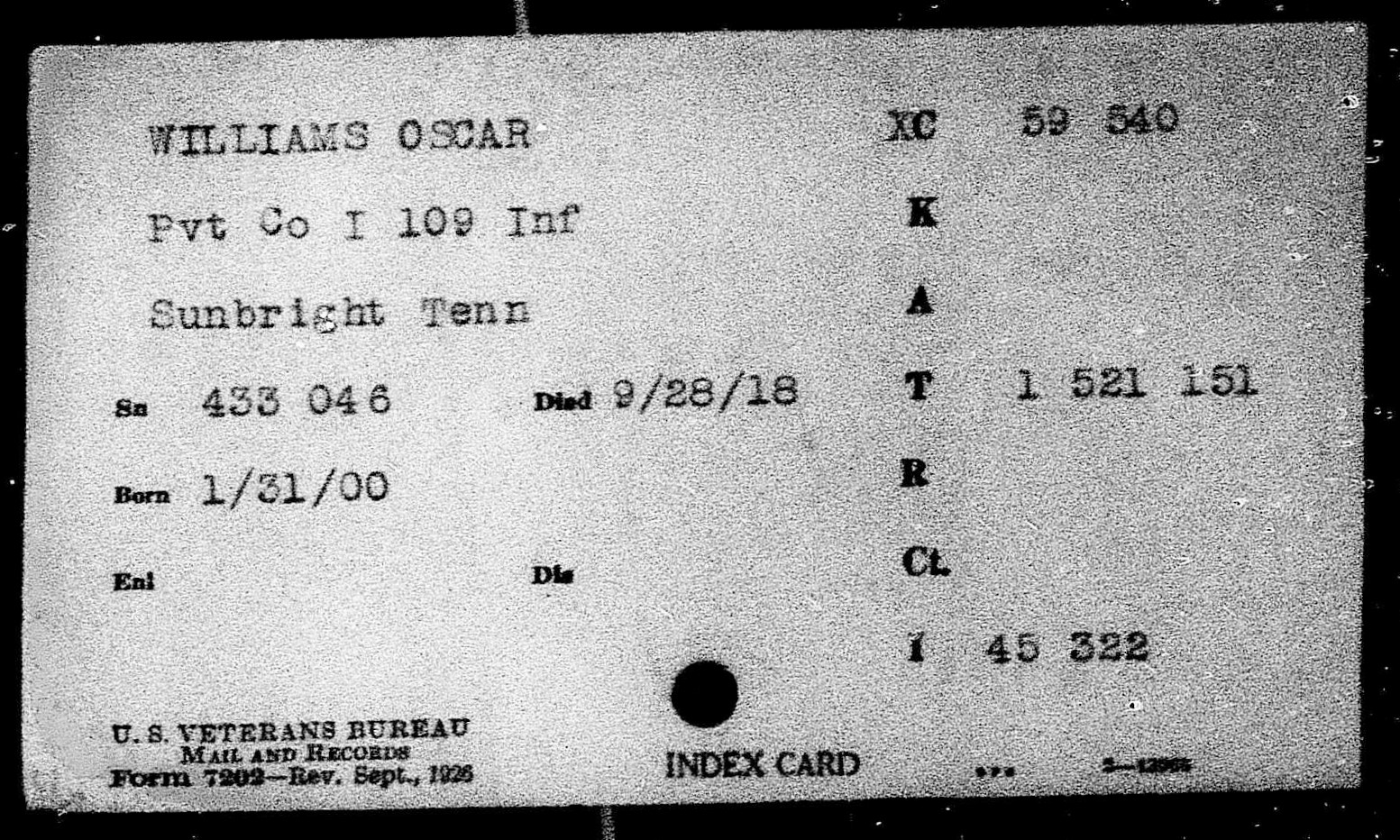 Private Oscar Williams of Sunbright, Tennessee served in Company I, 109th Infantry. He was killed in action in September 1918.