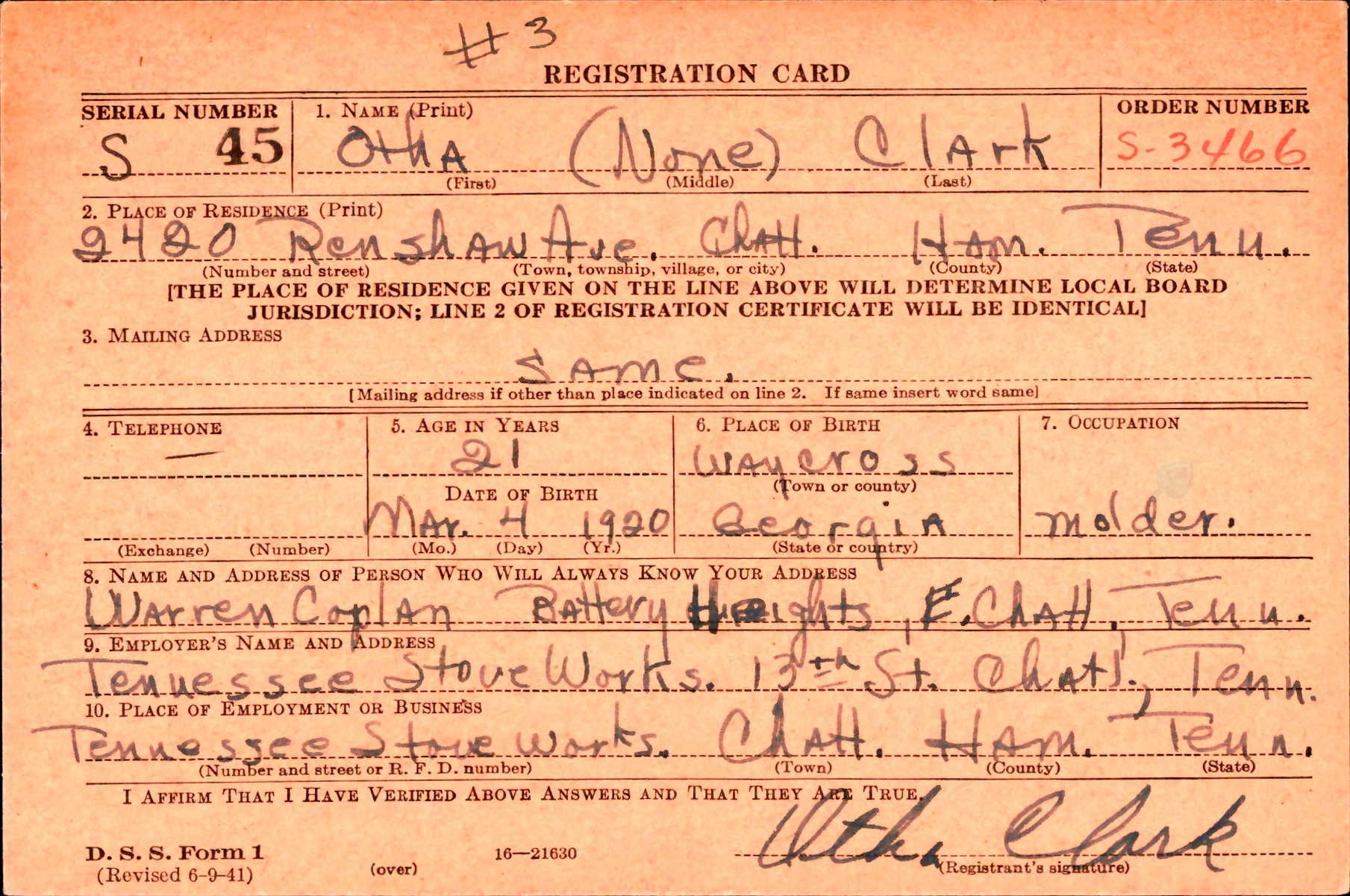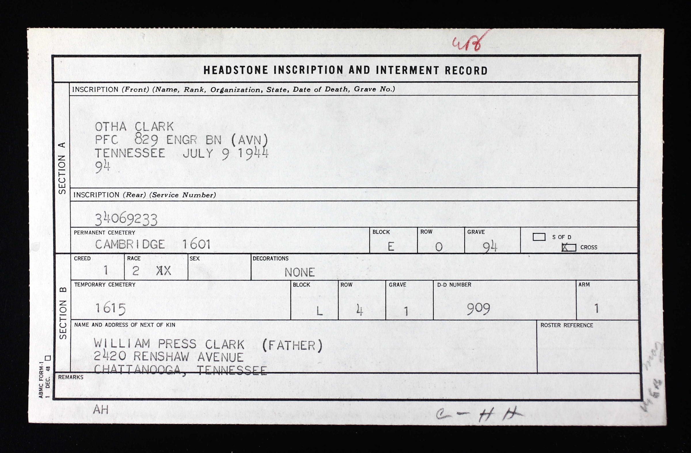 Pfc. Otha Clark, son of Mr. and Mrs. William P. Clark, 1001 Crutchfield Road is listed killed in action. Pfc. Clark died July 9 in Weedon, England, from a fractured skull received in an accident, his parents were informed by the War Department. He began army duty in 11942, and had served 23 months overseas. A former student at the Booker T. Washington High School, he was employed by the Tennessee Stove Works prior to entering the service. He is survived by his parents and three brothers, Sgt. William Clark, with the army in France; S1C Troy L. Clark, U.S Navy, and S/Sgt Albert Clark in army service at Orlando, Fla.