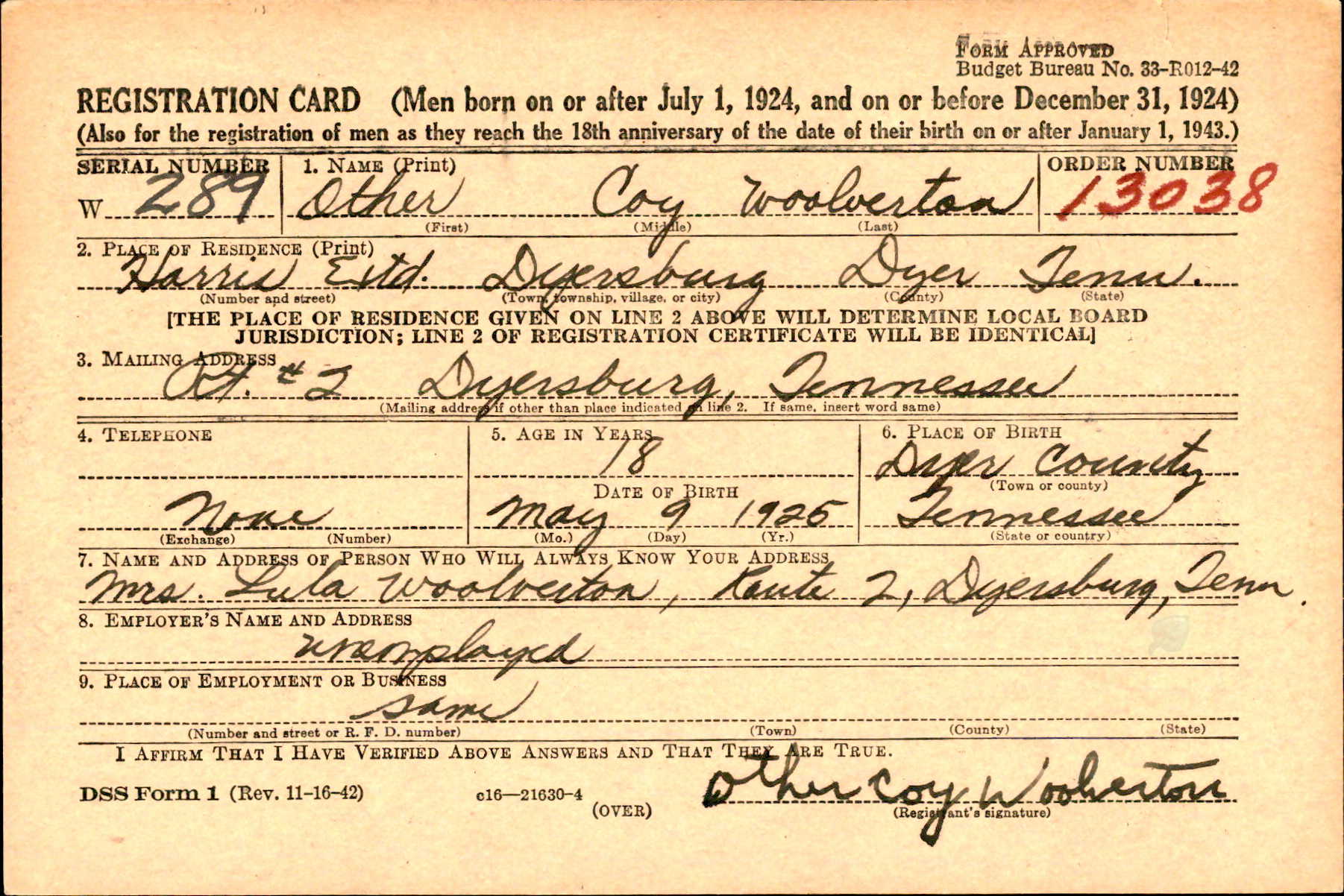 Other Coy Woolverton was born 9 May 1925 in Dyer County, Tennessee. He was the son of Arthur Leroy Wilson Woolverton and Lula Moore.