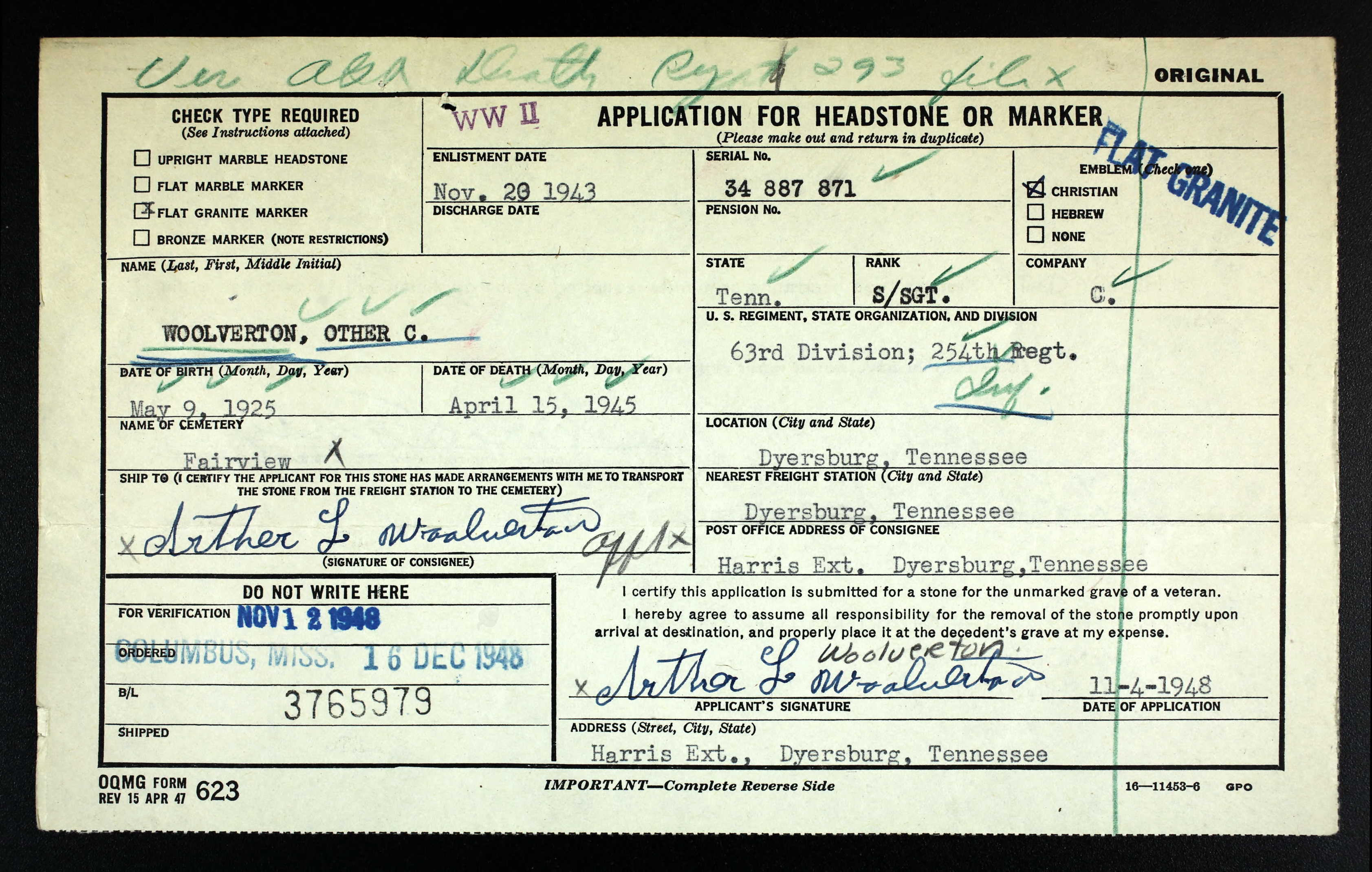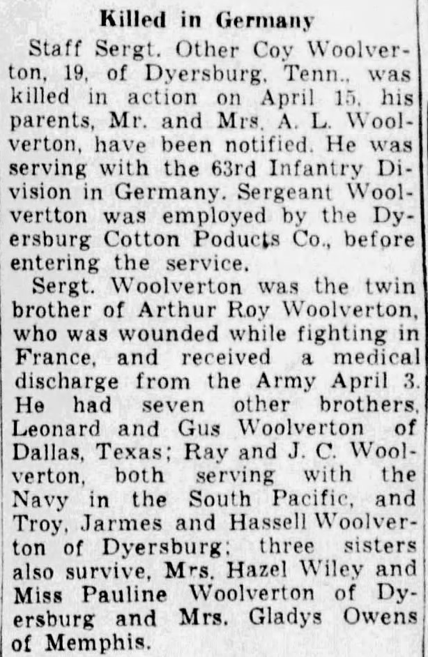 Staff Sergt. Other Coy Woolverton, 19, of Dyersburg, Tenn., was killed in action on April 15, his parents, Mr. and Mrs. A.L. Woolverton, have been notified. He was serving with the 63rd Infantry Division in Germany. Sergeant Woolverton was employed by the Dyersburg Cotton Products Co., before entering the service. Sergt. Woolverton was the twin brother of Arthur Roy Woolverton, who was wounded while fighting in France, and received a medical discharge from the Army April 3. He had seven other brothers, Leonard and Gus Woolverton, of Dallas, Texas; Ray and J.C. Woolverton, both serving with the Navy in the South Pacific, and Troy, James and Hassell Woolverton of Dyersburg; three sisters also survive, Mrs. Hazel Wiley and Miss Pauline Woolverton of Dyersburg, and Mrs. Gladys Owens of Memphis.