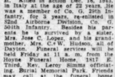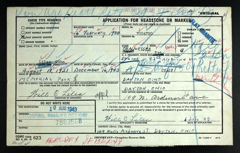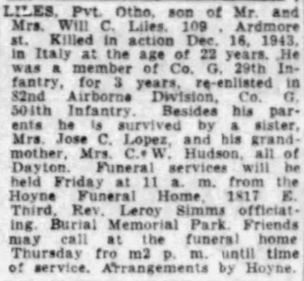 Otho Liles was born 18 August 1921 in Coalfield, Tennessee, the son of Will Liles and Lizzie Alma Hudson. He was a member of Company G, 29th Infantry, for three years, and re-enlisted in Company G of the 82nd Airborne Division, 50th Infantry. Pvt Liles was Killed in Action in Italy on 6 December 1943. He was 22 years of age when he died. He was survived by a sister, Mrs. Jose C. Lopez, a grandmother, Mrs. C.W. Hudson and his parents.