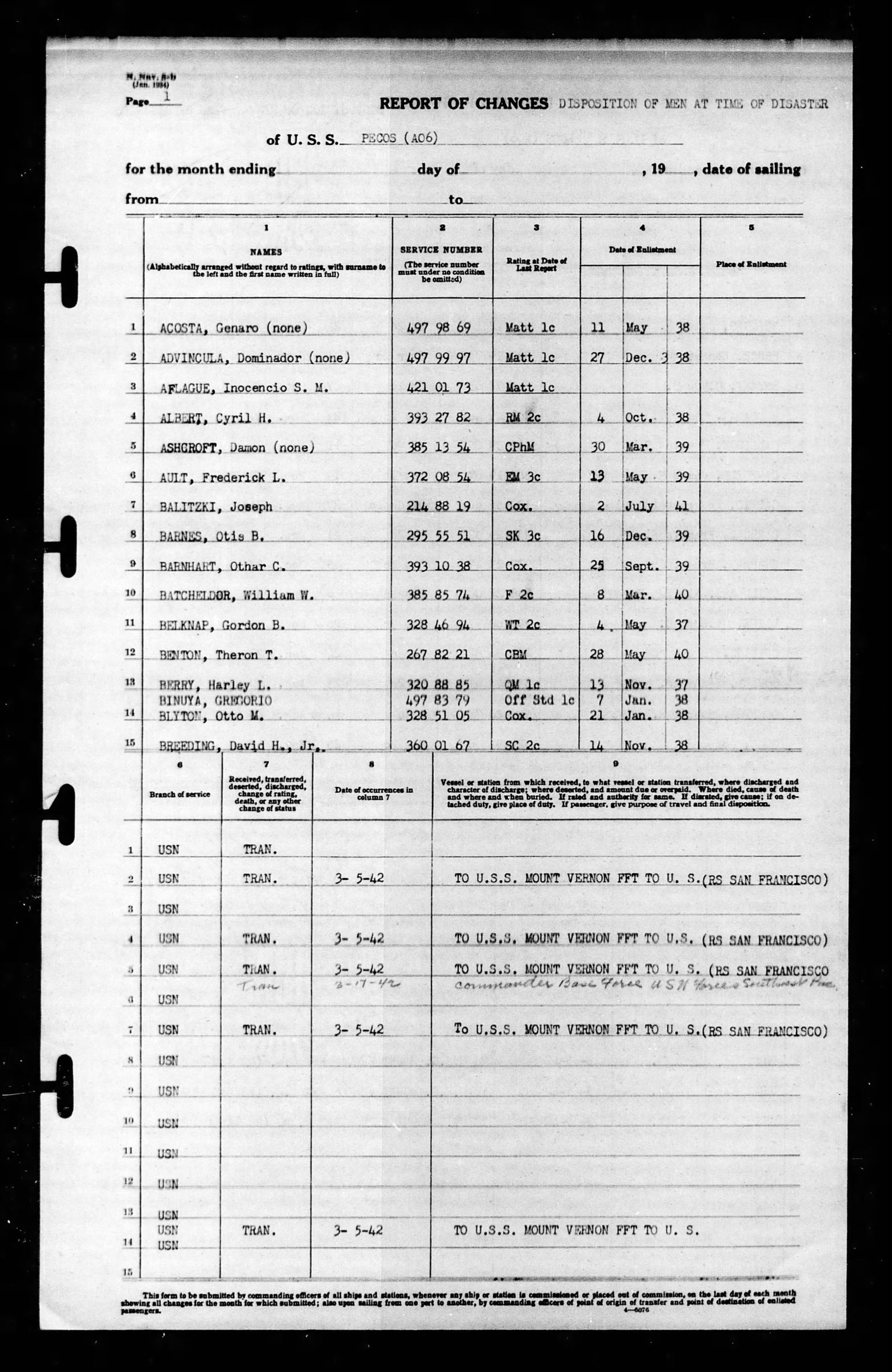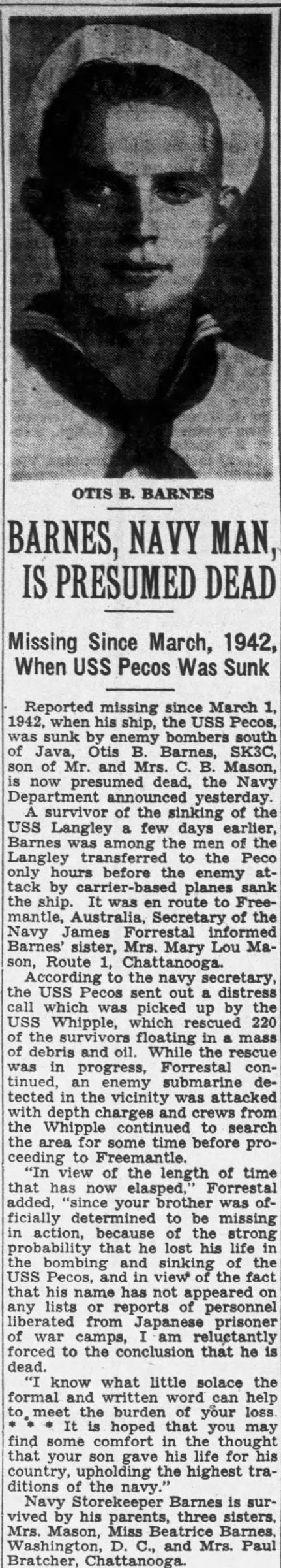 Reported missing since March 1, 1942, when his ship, the USS Pecos was sunk by enemy bombers south of Java, Otis B. Barnes, SK3C, son of Mr. and Mrs. C.B. Mason, is now presumed death, the Navy Department announces yesterday. A survivor of the sinking of the USS Langley a few days earlier, Barnes was among the men of the Langley transferred to the Peco only hours before the enemy attack by carrier-based planes sank the ship. It was en route to Freemantle, Australia, Secretary of the Navy James Forrestal informed Barnes’ sister, Mrs. Mary Lou Mason, Route , Chattanooga. According to the navy secretary, the USS Pecos sent out a distress call which was picked up by the USS Whipple, which rescued 220 of the survivors floating in a mass of debris and oil. While the rescue was in progress, Forrestal continued, an enemy submarine detected in the vicinity was attacked with depth charges and crews from the Whipple continued to search the area for some time before proceeding to Freemantle. “In view of the length of time that has now elapsed,” Forrestal added, “since your brother was officially determined to be missing in action, because of the strong probability that he lost his life in the bombing and sinking of the USS Pecos, and in view of the fact that his name has not appeared on any lists or report of personnel liberated from Japanese prisoner of war camps, I am reluctantly forced to the conclusion that he is dead. I know what little solace the formal and written word can help to meet the burden of your loss. *** It is hoped that you may find some comfort in the thought that your son gave his life for his country, upholding the highest traditions of the navy.”