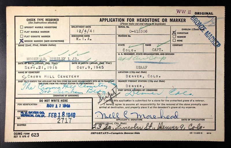 Presley Leland Morehead Jr. was born on 21 September 1916 at Denver, Colorado, the son of Presley Leland Morehead and Nellie Irene Cavault. Husband of Nellie Irene Cavault.
