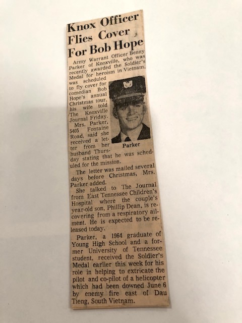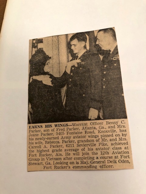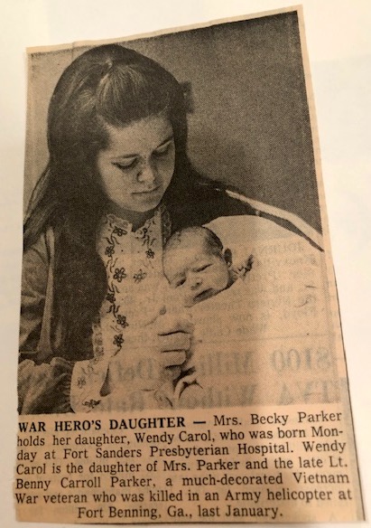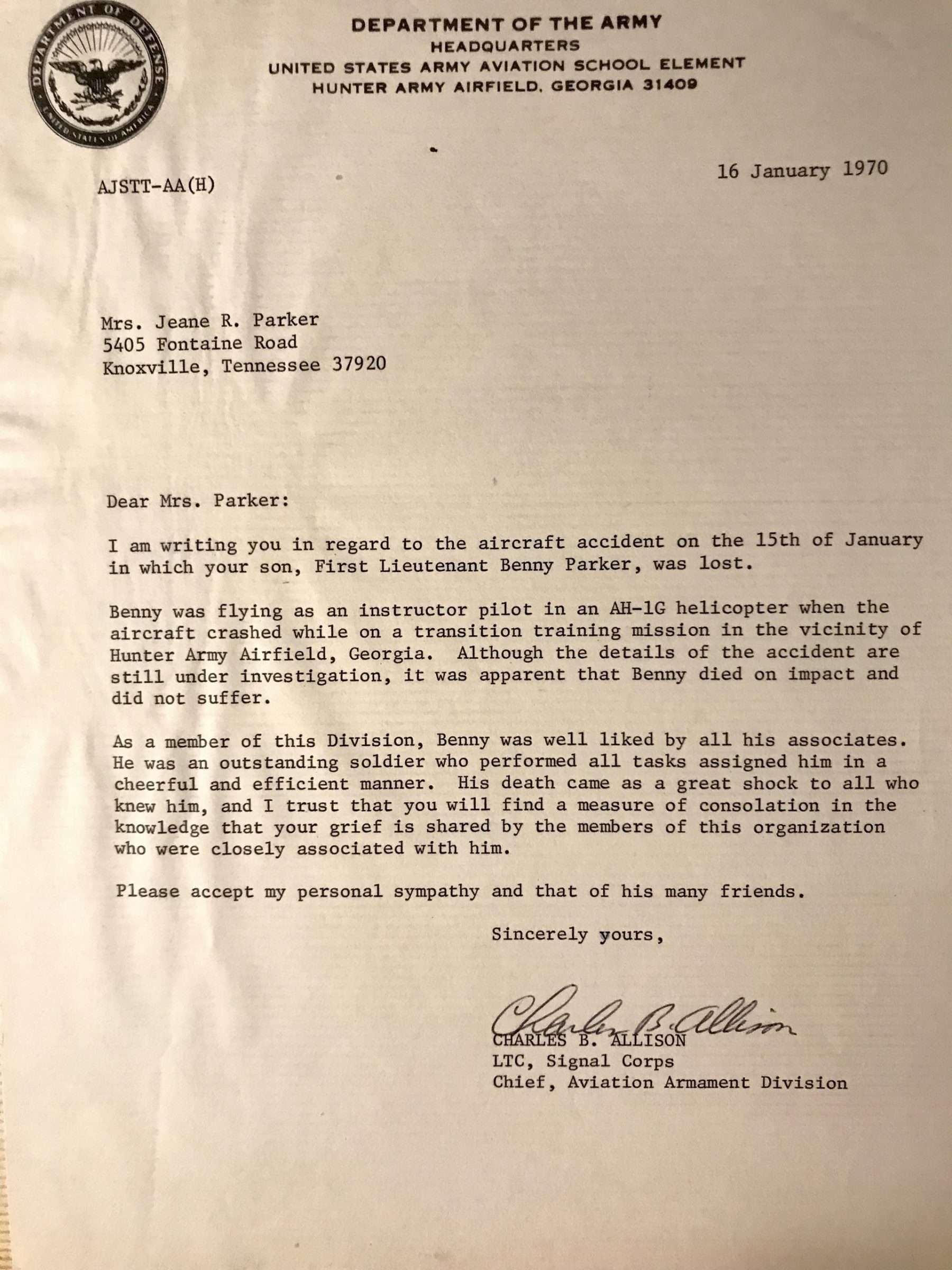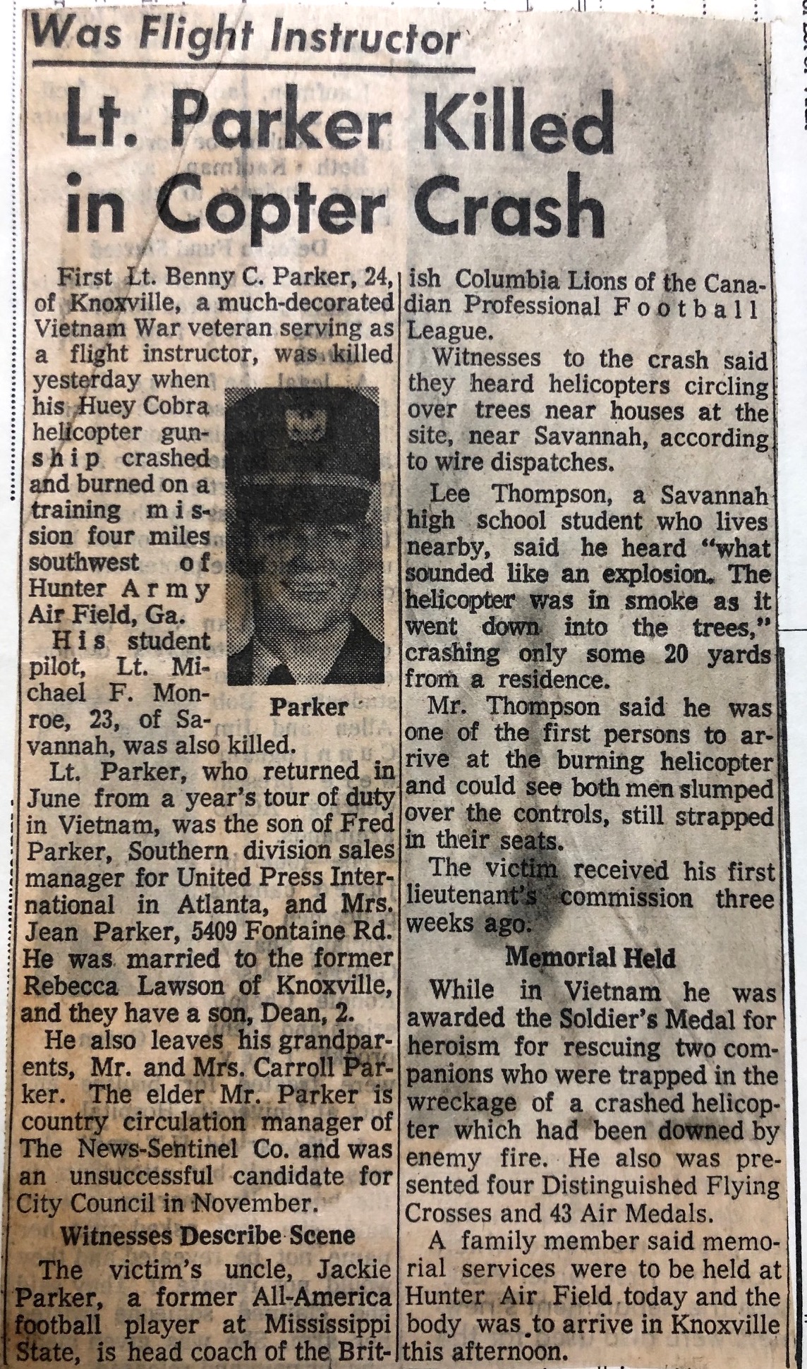 1st Lieutenant Benny Carroll Parker was born August 16, 1945 in Knoxville, Tennessee. He voluntarily joined the US Army when he was 22 while attending the University of Tennessee and was a member of their ROTC. He was a Huey Cobra helicopter pilot serving a year in Vietnam in 1968. After his highly decorated tour in Vietnam he was assigned as a training instructor in Savannah, Ga. when his helicopter malfunctioned and both he and his student were killed.