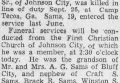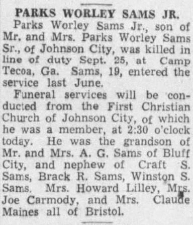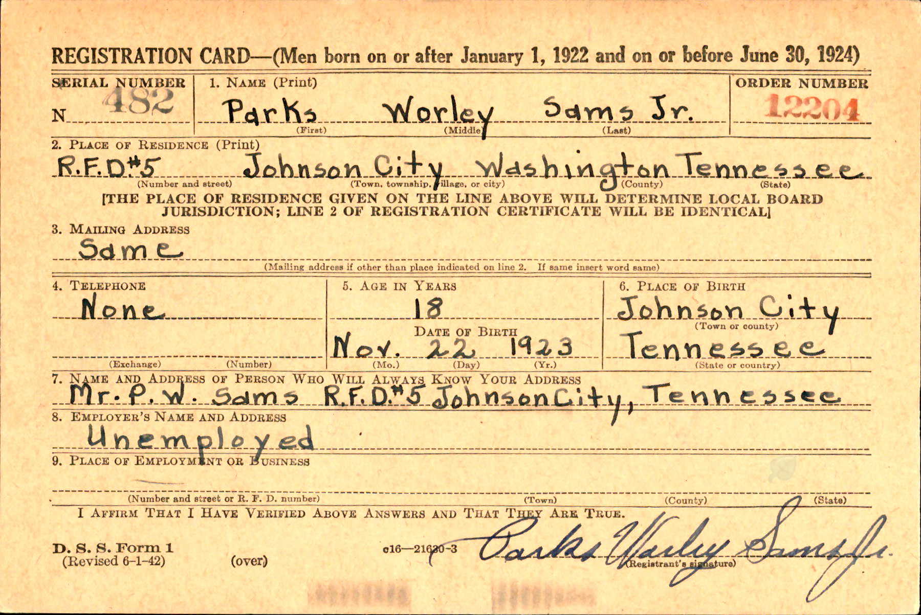 Parks Worley Sams was born on 22 November 1923, Johnson City, Washington County, Tennessee, USA