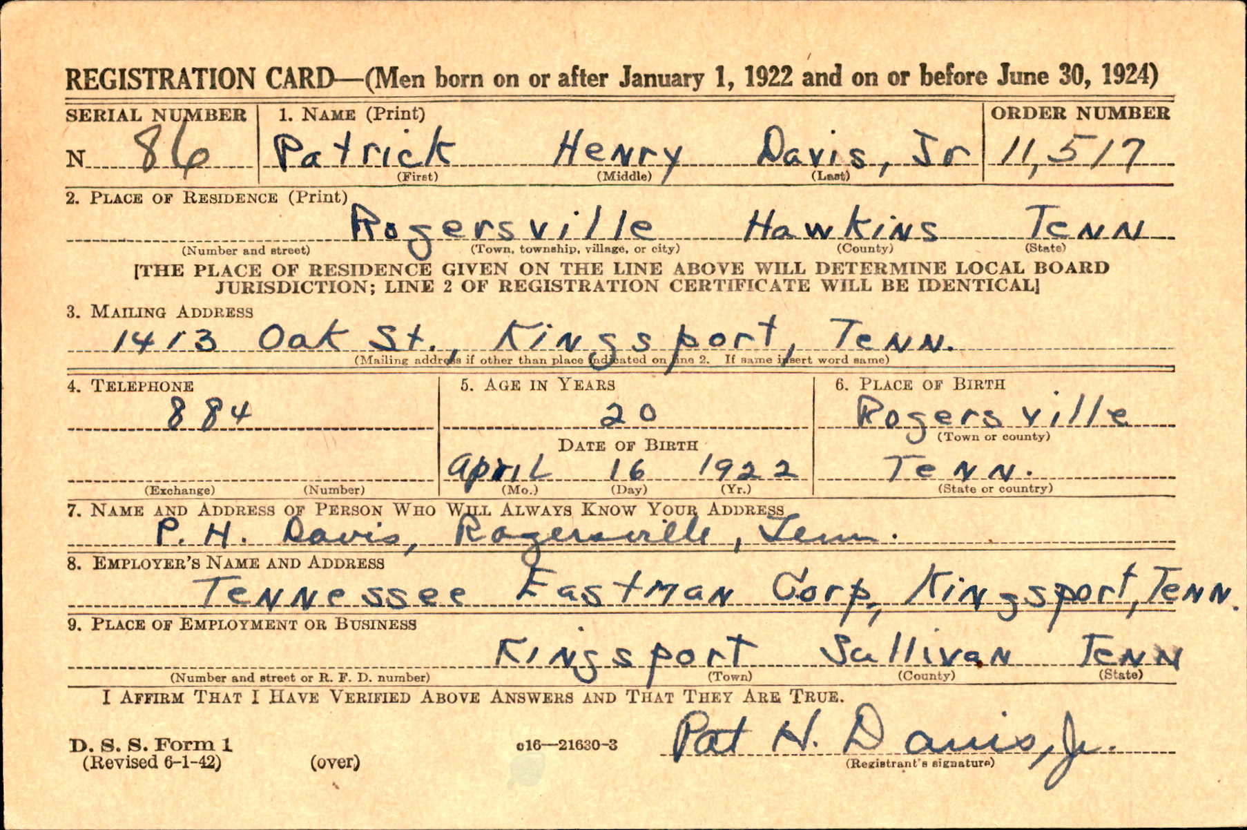Patrick Henry Davis was born on 16 April 1922 to Patrick Henry Davis Sr. and Buena Bledsoe.