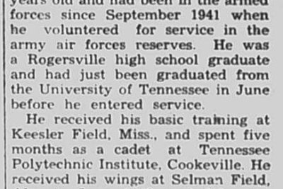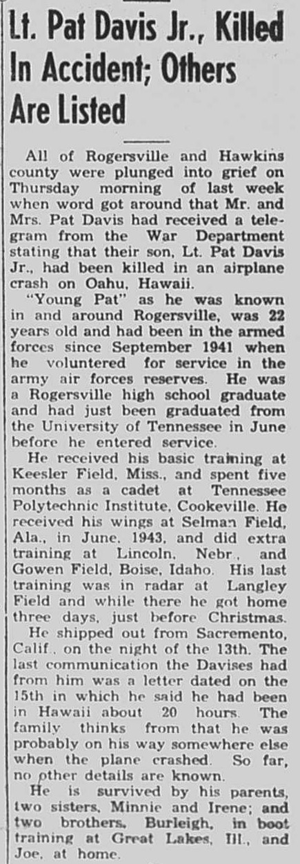 All of Rogersville and Hawkins county were plunged into grief on Thursday morning of last week when word got around that Mr. and Mrs. Pat Davis had received a telegram from the War Department stating that their son, Lt. Pat Davis Jr., had been killed in an airplane crash on Oahu, Hawaii. “Young Pat”, as he was known in and around Rogersville, was 22 years old and had been in the armed forces since September 1941 when he volunteered for service in the army air forces reserves. He was a Rogersville high school graduate and had just been graduated from the University of Tennessee in June before he entered service. He received his basic training at Keesler Field, Miss., and spent five months as a cadet at Tennessee Polytechnic Institute, Cookeville. He received his wings at Selma Field, Ala., in June, 1943, and did extra training at Lincoln, Nebr. And Goven Field, Boise, Idaho. His last traning was in radar at Langley Field and while there he got home three days, just before Christmas. He shipped out from Sacremento, Calif.on the night of the 13th. The last communication the Davises had from him was a letter date don the 15th in which he said he had been in Hawaii about 20 hours. The family thinks from that he was probably on his way somewhere else when the plane crashed. So far, no other details are known.