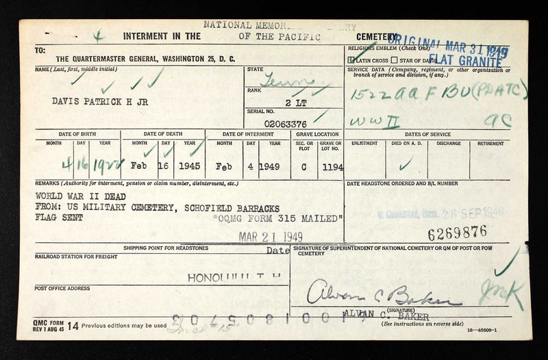 - Burial/Memorial Location: Honolulu Memorial, Honolulu, Hawaii